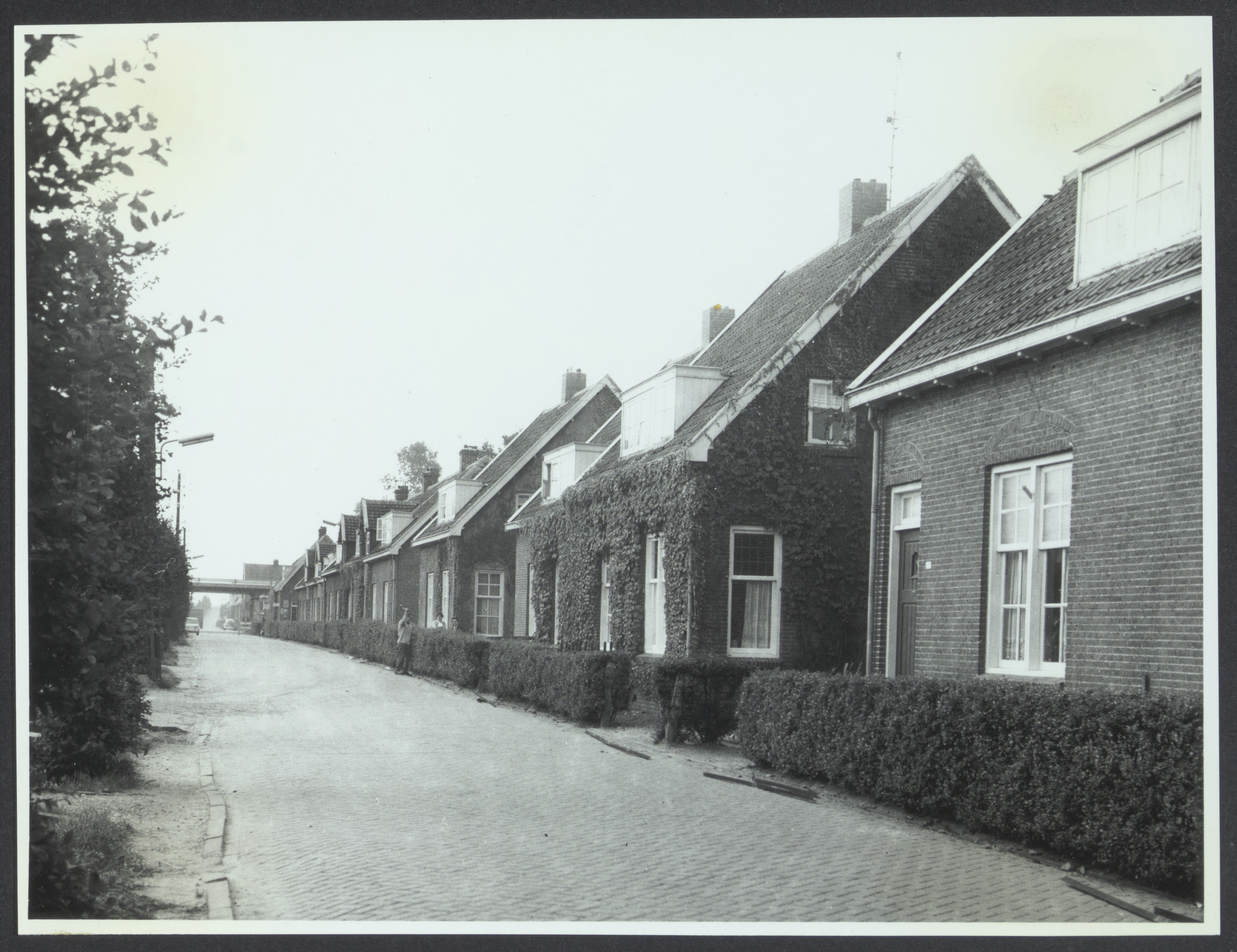 links de woningen van volkshuisvesting. Dit is dus het gedeelte van de Nieuweweg, gelegen tussen rijksweg en wetering. In de verte is het rijksweg viaduct te zien en de stoep naar de dijk.