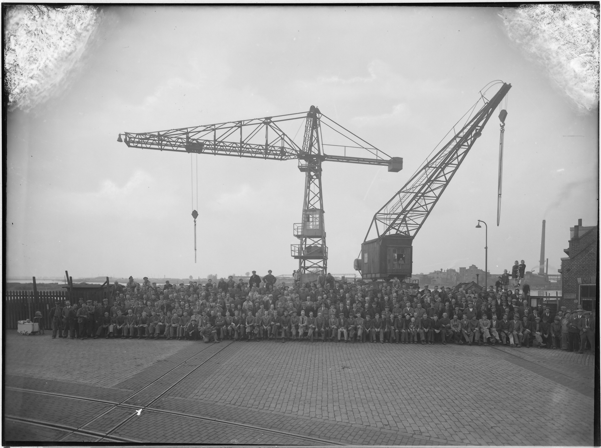 - Groepsportret van het personeel van metaalindustriebdrijf Penn & Bauduin aan de 's-Gravendeelsedijk