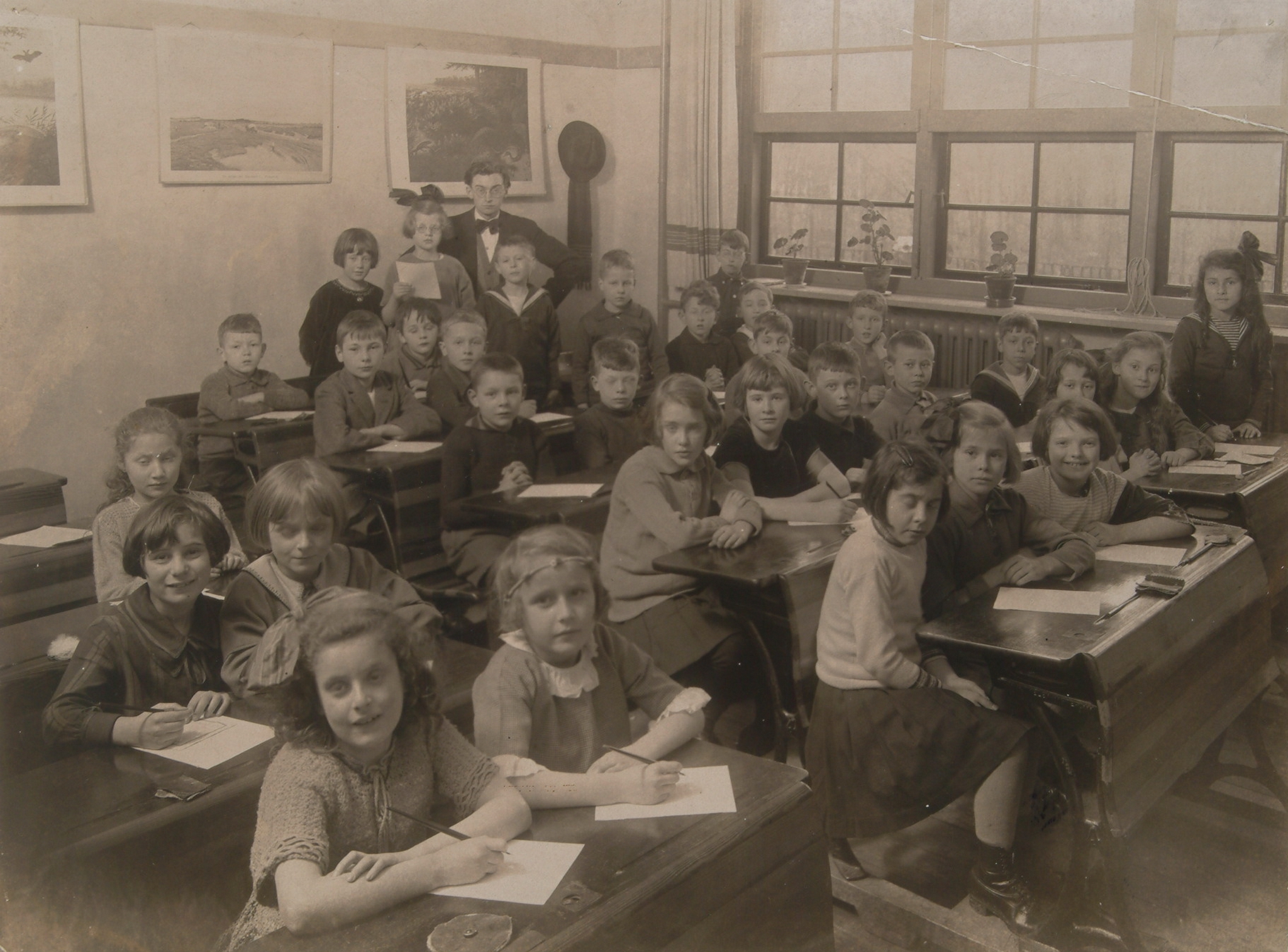 Klassenfoto van een klas van school Mühring met onderwijzer Hazelaar