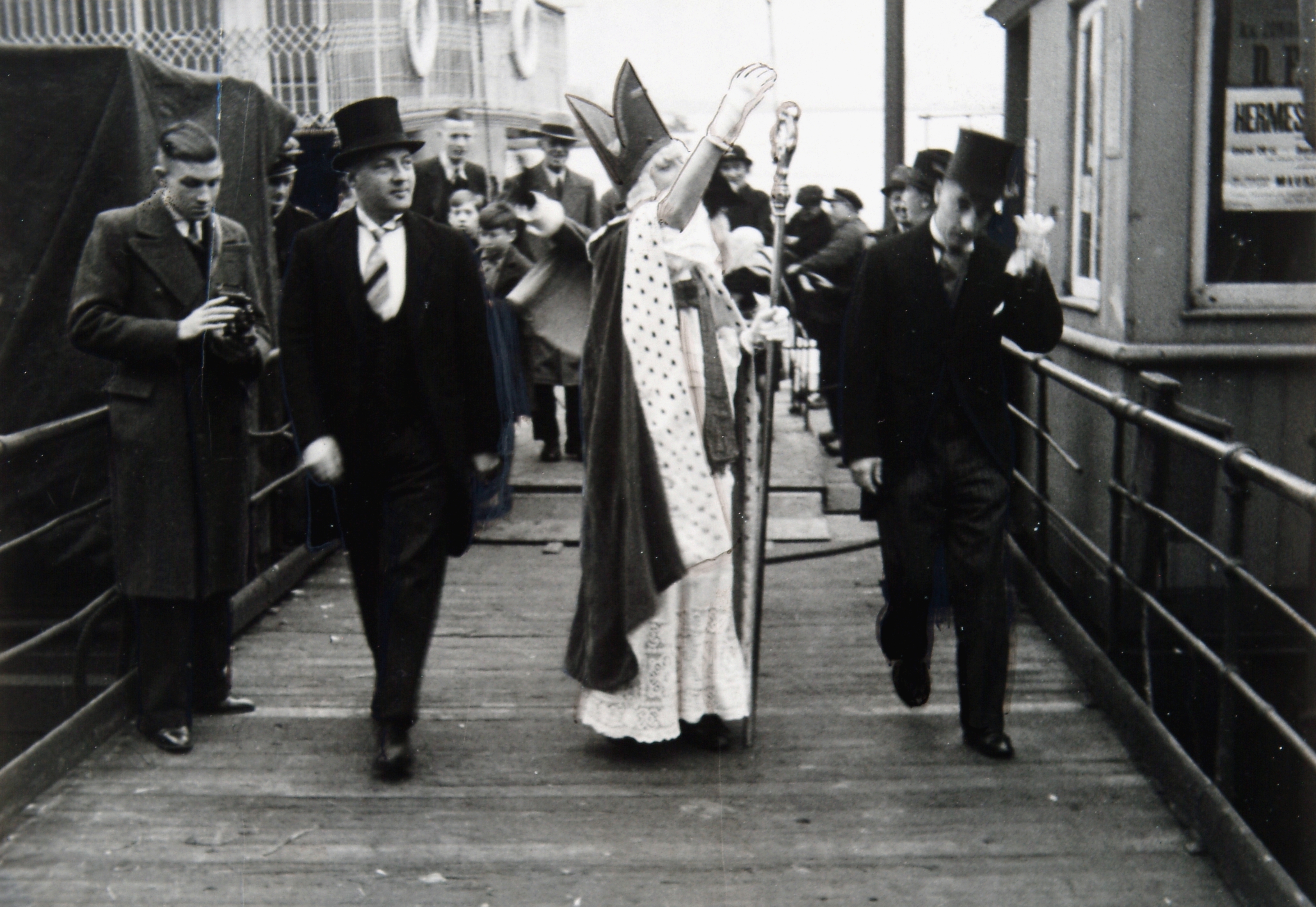 Sint Nicolaas wordt bij zijn aankomst op het Groothoofd begeleid door heren van Vroom …