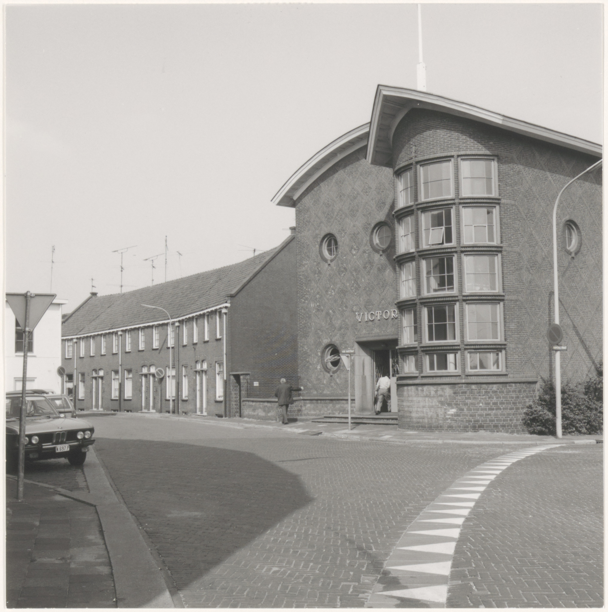 Het feest- en kantinegebouw van biscuitfabriek Victoria op de hoek van de Hoge Bakstraat en de Havenstraat, gezien vanaf de Korte Parallelweg.