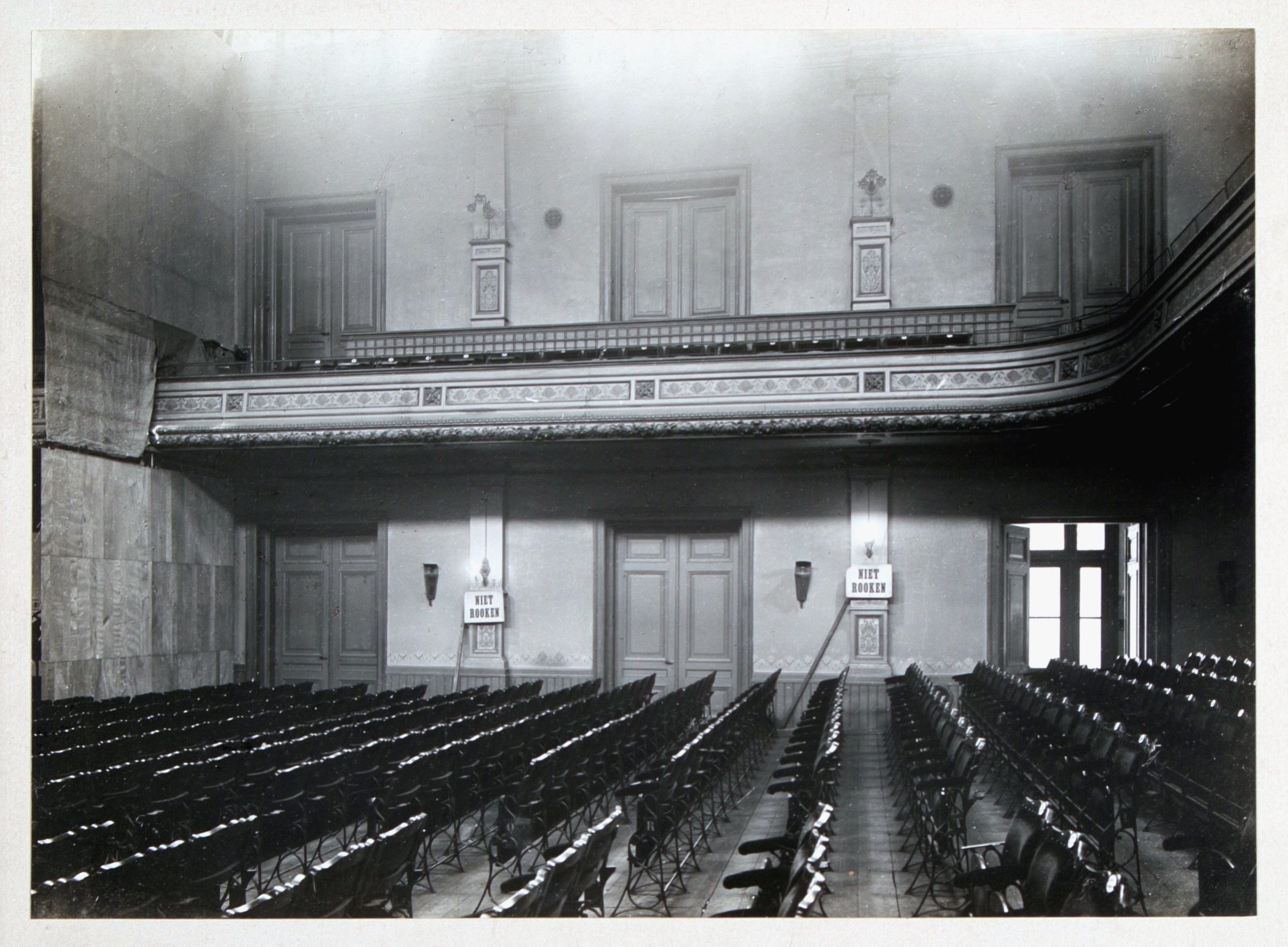 - Op de bordjes langs de zijkanten staat 'niet rooken' Voor de verbouwing van 1938 van Sybold van Ravesteyn