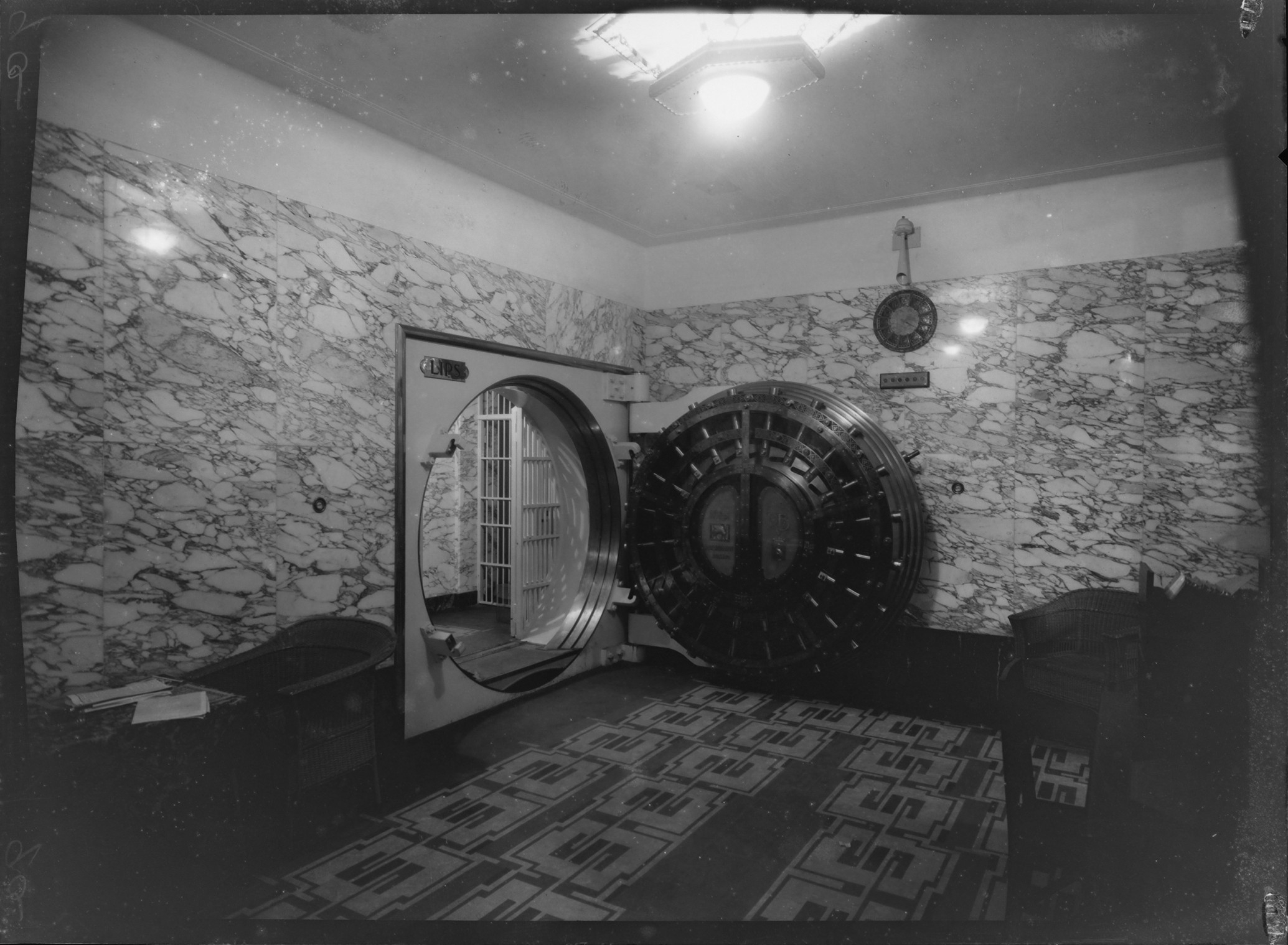 Lips kluisdeur in het pand van de Rotterdamsche bankvereniging (Robaver) 1923-1964. Voorheen was dit de Nationale Bank, gevestigd aan de Kneuterdijk 8 in Den Haag. (De Nat. Bank werd in 1915 overgenomen door de Robaver.)