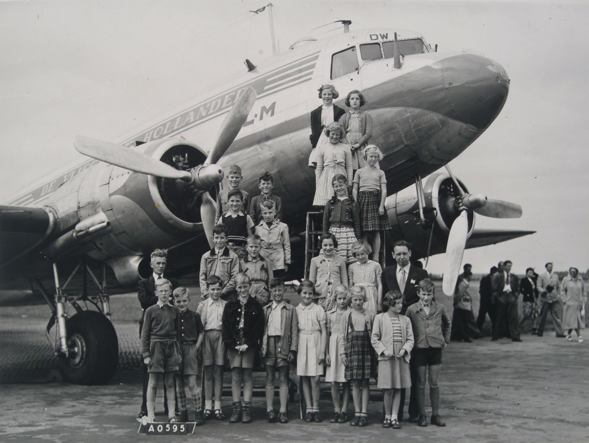 - Leerlingen van school Mühring voor een Fokker vliegtuig van de KLM tijdens een uitstapje naar Schiphol