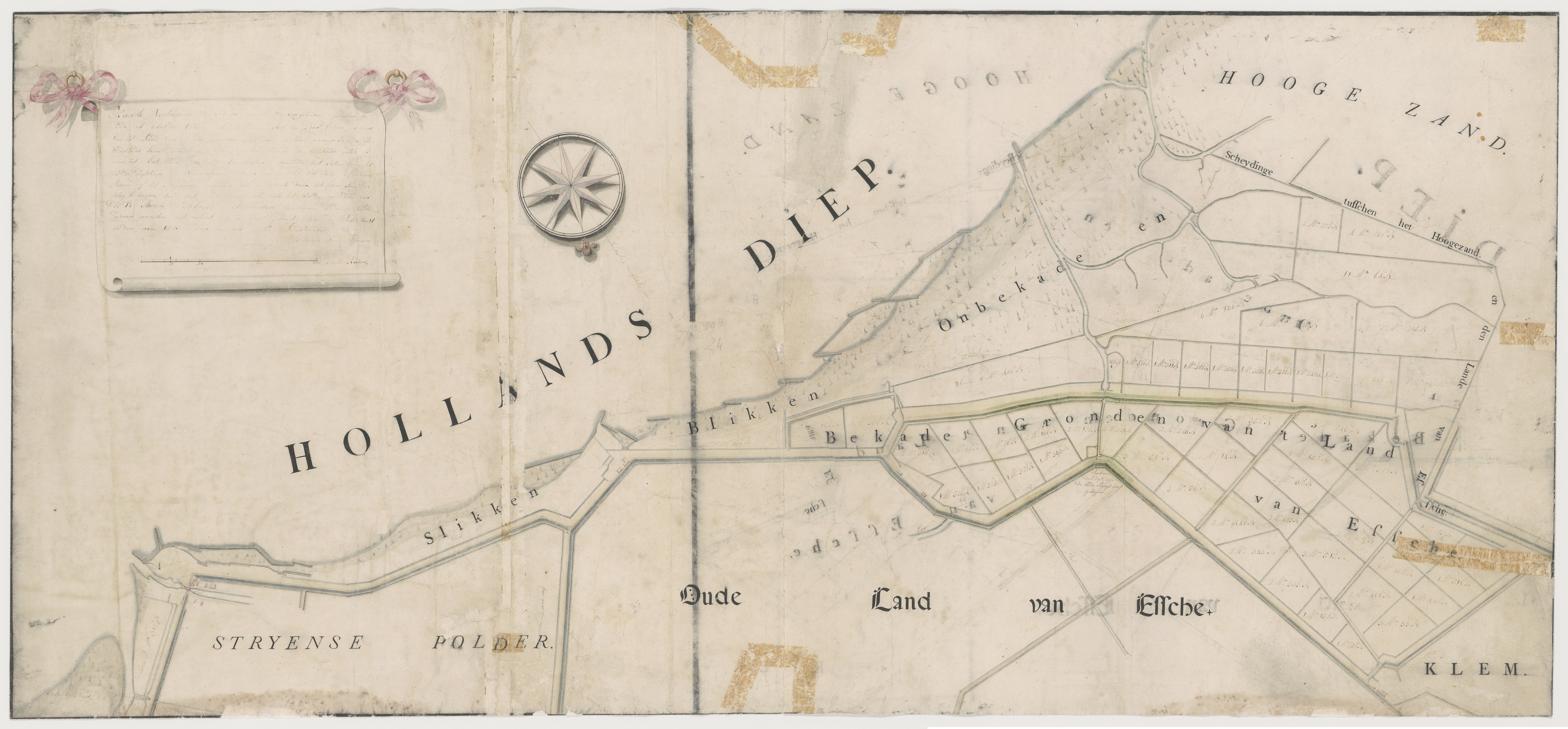 - Kaart van slikken, blikken, onbekade en bekade gorzen gelegen voor de Strijensche Polder en voor het Oude Land van Essche. Door Adriaan van der Linden, 1775