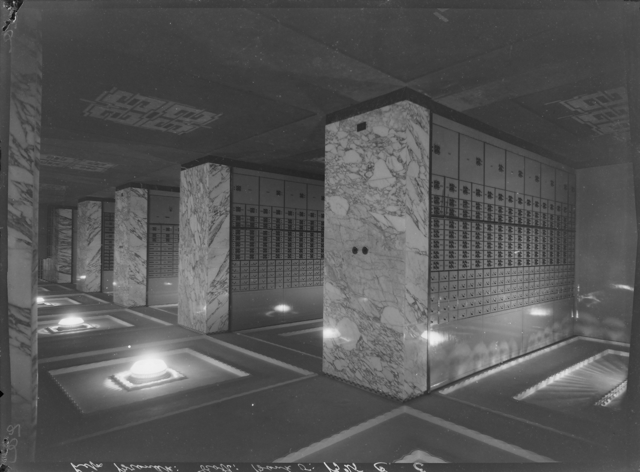 Safe loketten in de kluisruimte van de Rotterdamsche bankvereniging (Robaver) 1923-1964. Voorheen was dit de Nationale Bank, gevestigd aan de Kneuterdijk 8 in Den Haag. (De Nat. Bank werd in 1915 overgenomen door de Robaver.)