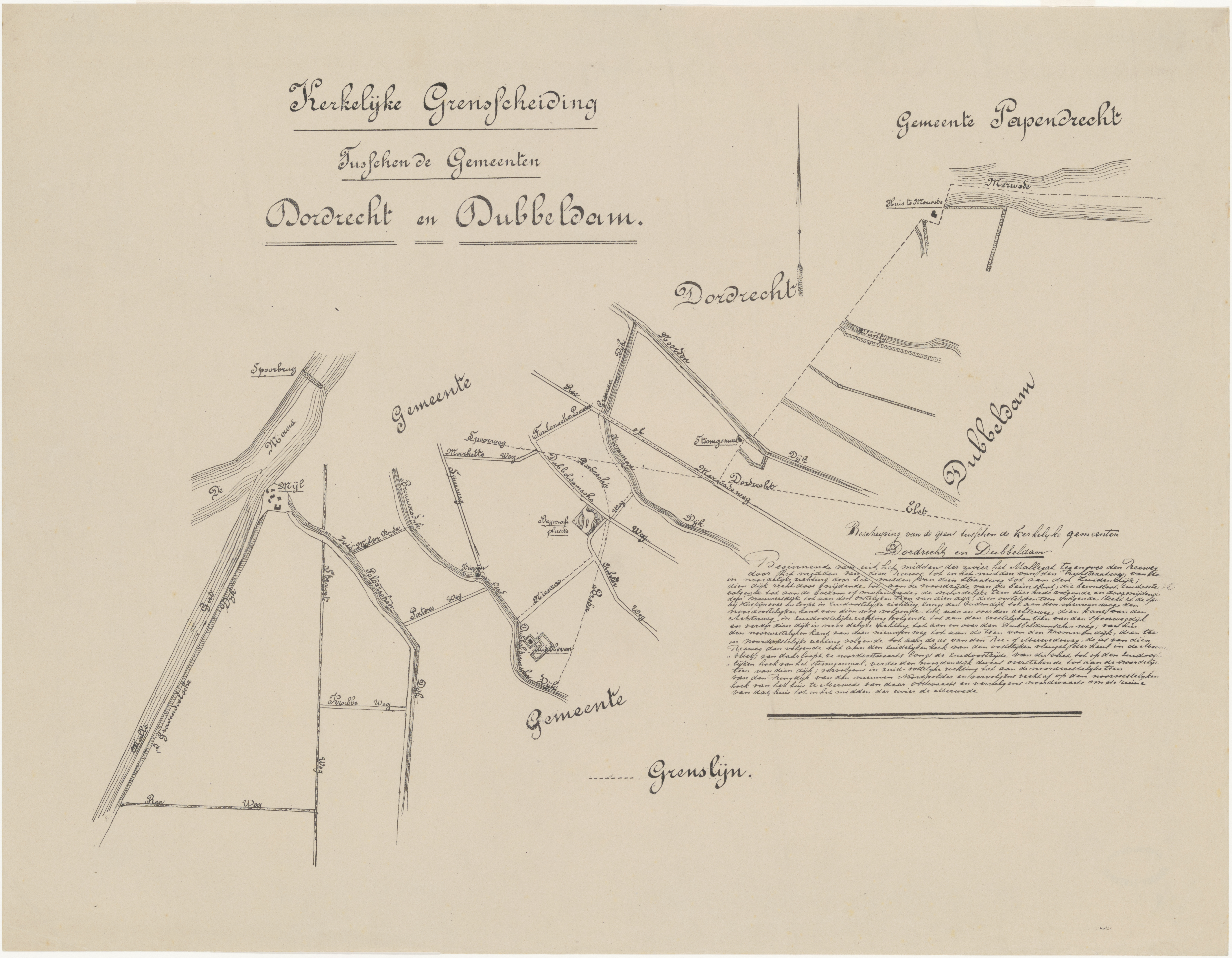 Kaart met aanduiding van de kerkelijke grensscheiding tussen de gemeenten Dordrecht en Dubbeldam, met toevoeging van een beschrijving van die scheiding.