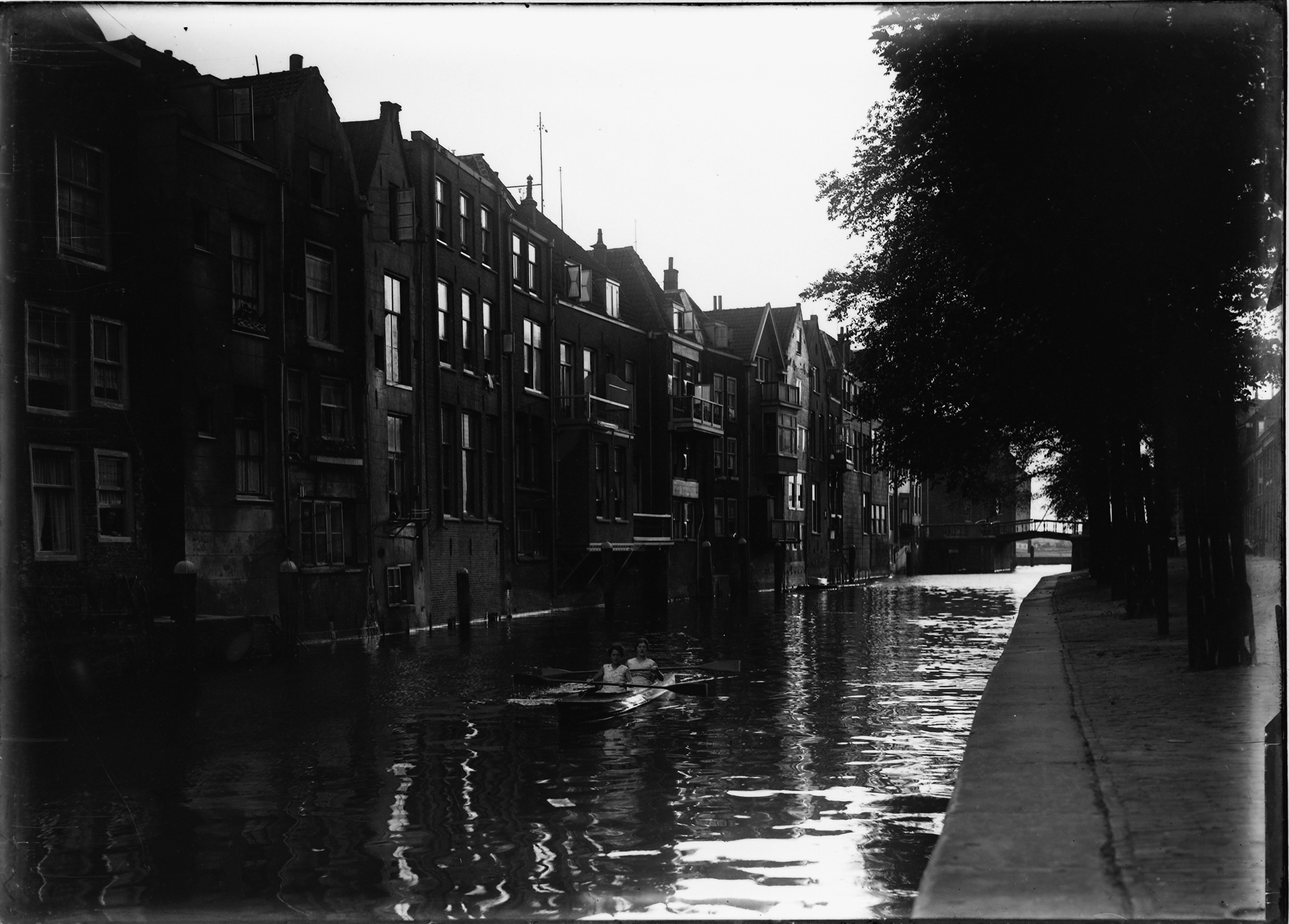 - De Voorstraatshaven van Pottenkade (rechts) richting Leuvebrug. De huizen staat aan de Voorstraat.