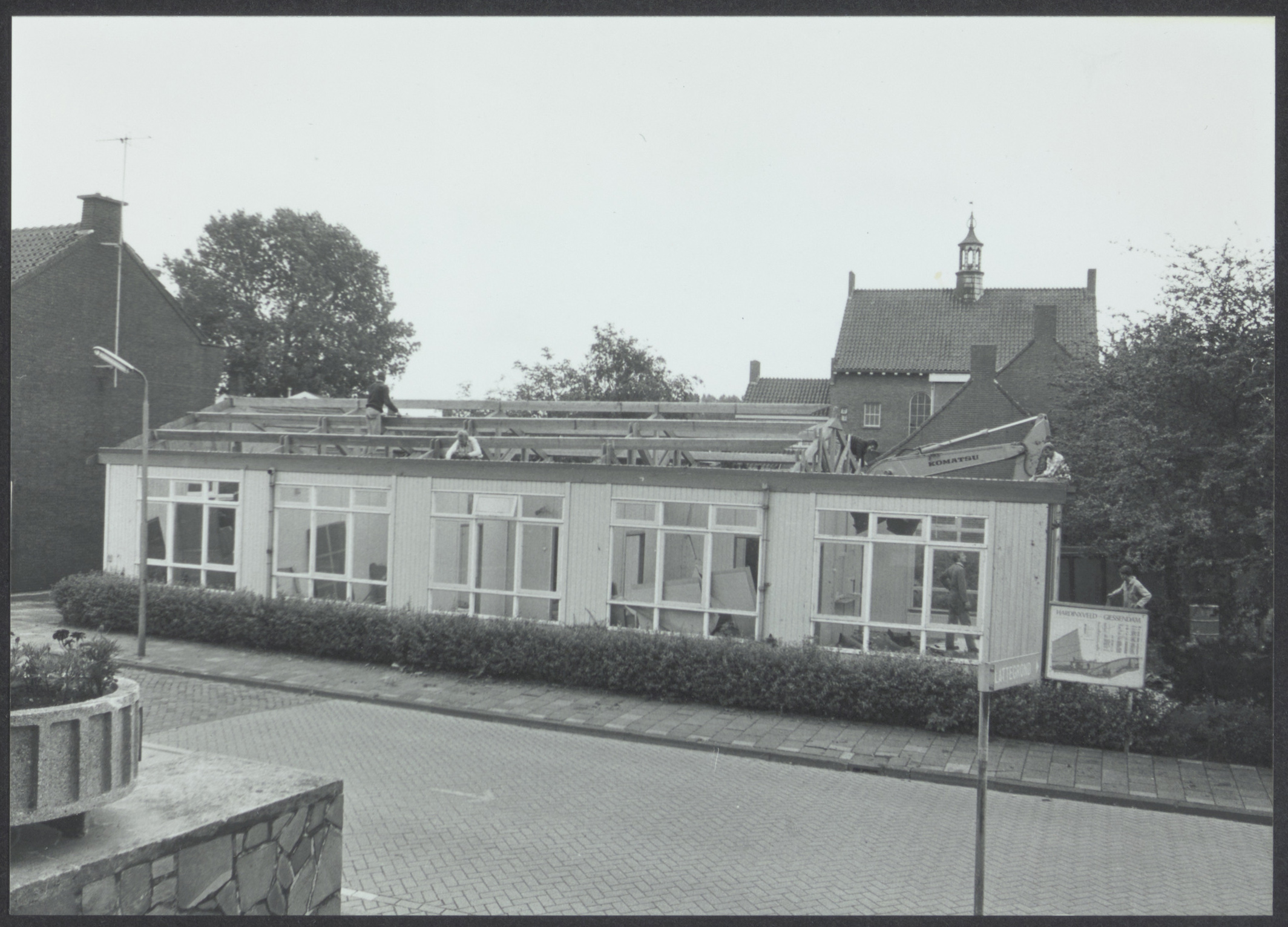 Uitbreiding ruimte achter het Oude Gemeentehuis aan de Damstraat. We kijken vanaf station Hardinxveld-Giessendam naar de opbouw van de houten keet.