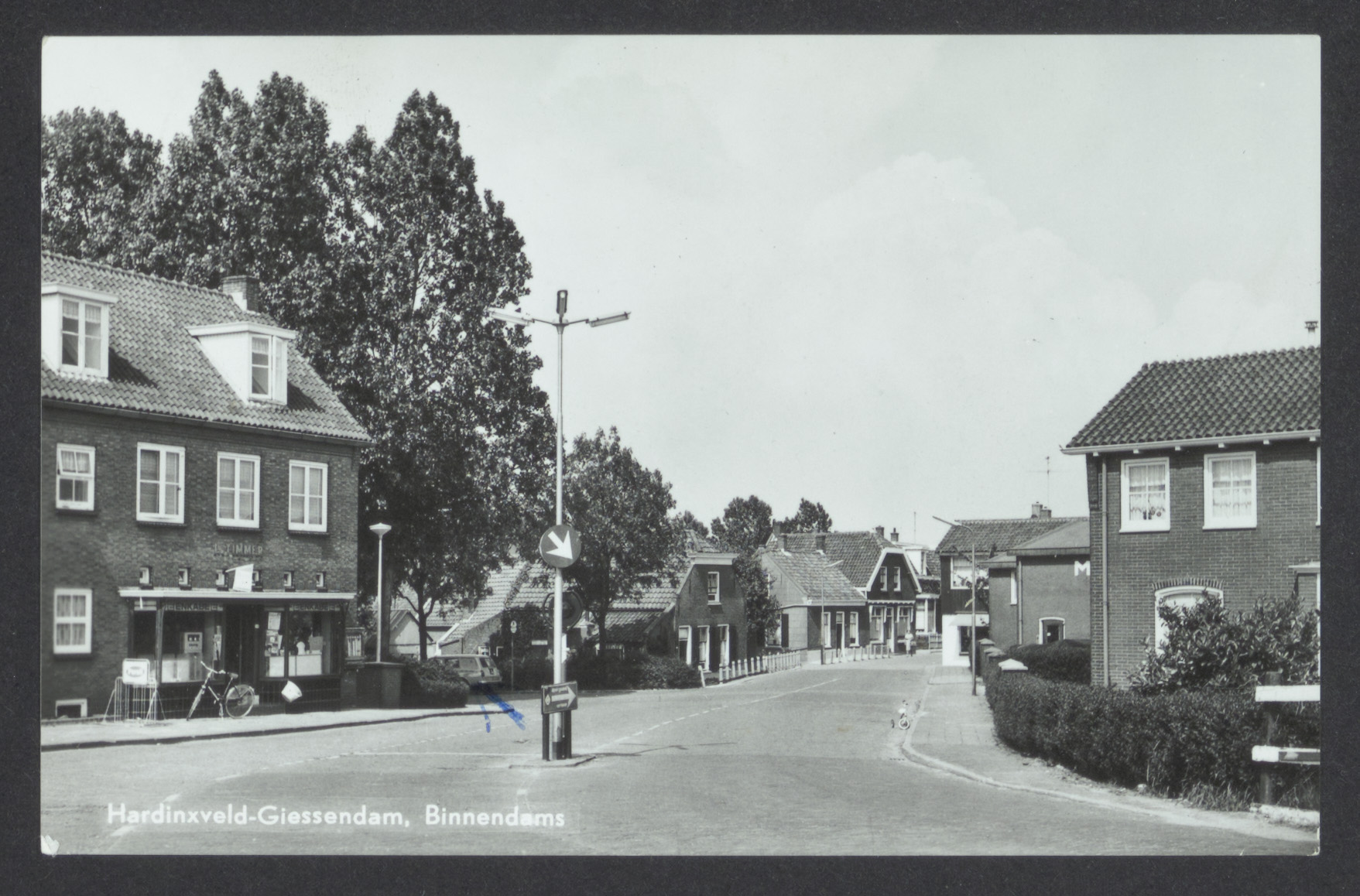 De winkel van Kruidenier Leen Timmer gezien vanaf de Spoorweg richting Binnendamseweg in Hardinxveld-Giessendam. Op de hoek met de Oranjestraat een bus van de “Twee Provincien”. In de Oranjestraat woonde 2 chauffeurs van TP n.l. Gijs van den Brugge en Beuzekom Dit was de eerste zelfbedieningswinkel in ons dorp! Zeer vooruitstrevend destijds!