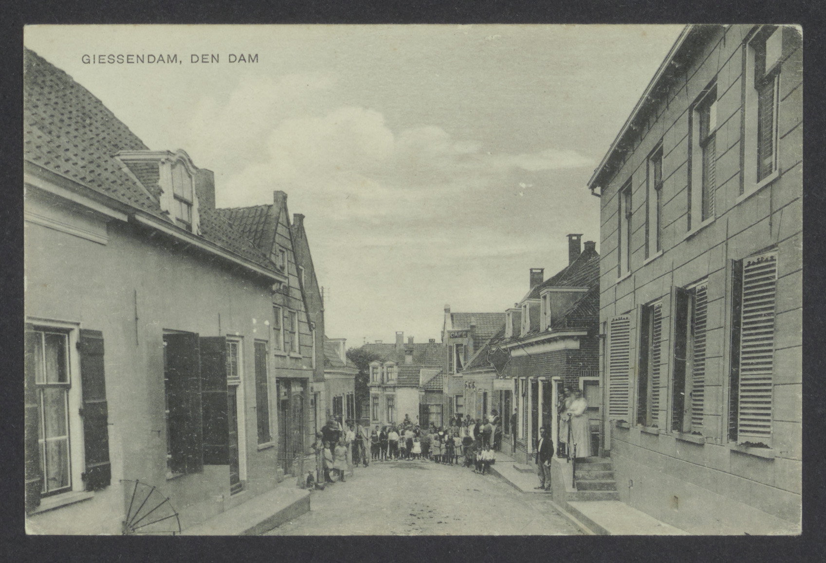 In de tijd van de foto heette het hier nog Binnendams 2e huis links Damstraat 72 de schilderswinkel van Bakker, links daarnaast Dukel. Rechts van de schilderswinkel 68, waar o.a.Soundtrack en de stomerij van Suiker was, dan bij de eerste telefoonpaal de steeg naar korenmolen "De Hoop" en dan 62 waar fietsenmaker van Houwelingen zat. De afrit van de Damstraat werd ‘Het hangen van den Dam’ genoemd. Rechts zien we nog de gevel van Hotel de Zwaan, waar Reijer Dekker de scepter zwaaide. Daarnaast Café ’s Lands Welvaren’ en verderop Cafe ‘Het Scheepje’ Het witte huizen complex was gebouwd voor de rekening van de diaconie.