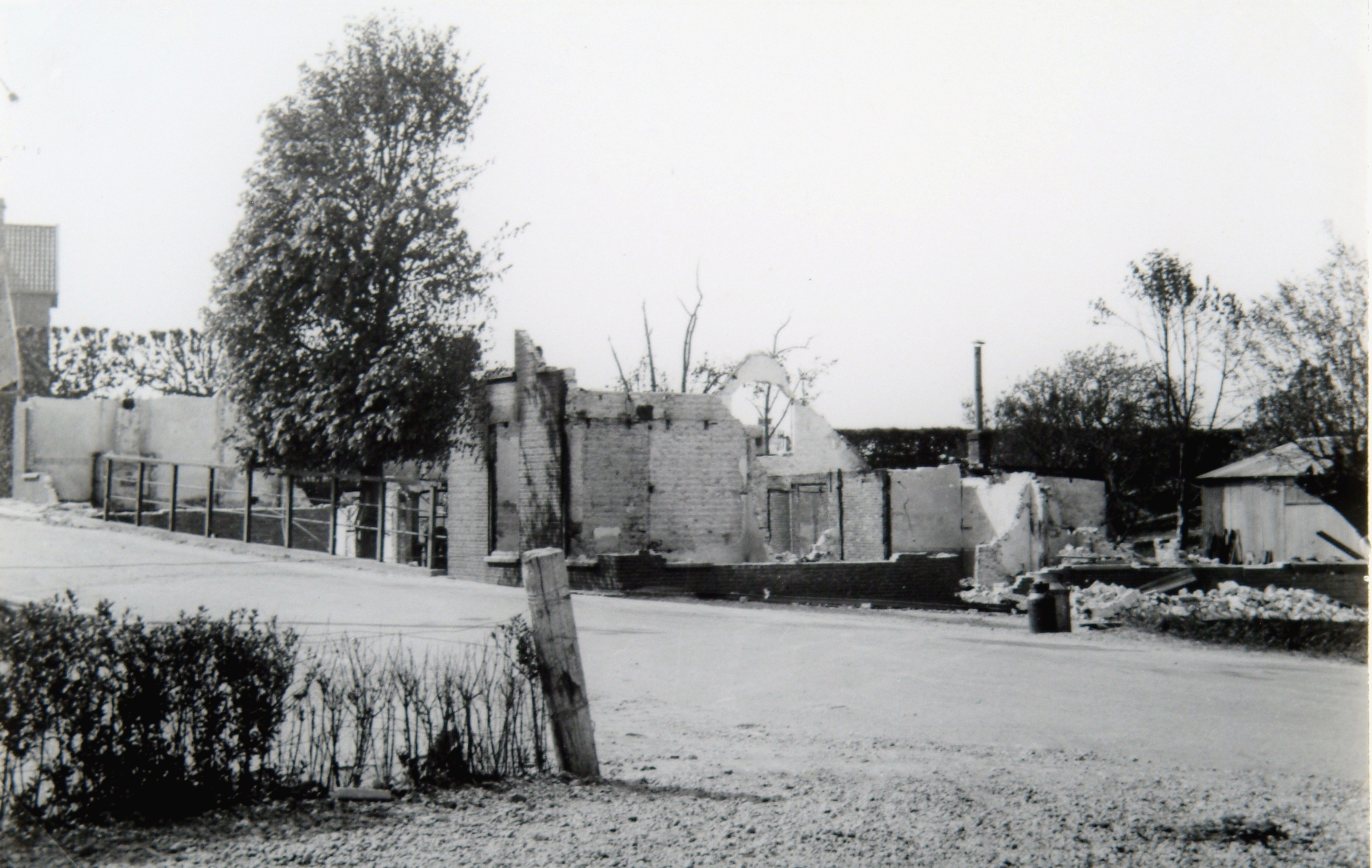 Door beschietingen in mei 1940 beschadigde bebouwing aan Reeweg Zuid, nummers 2-10, over de weg naar de Kil gezien.