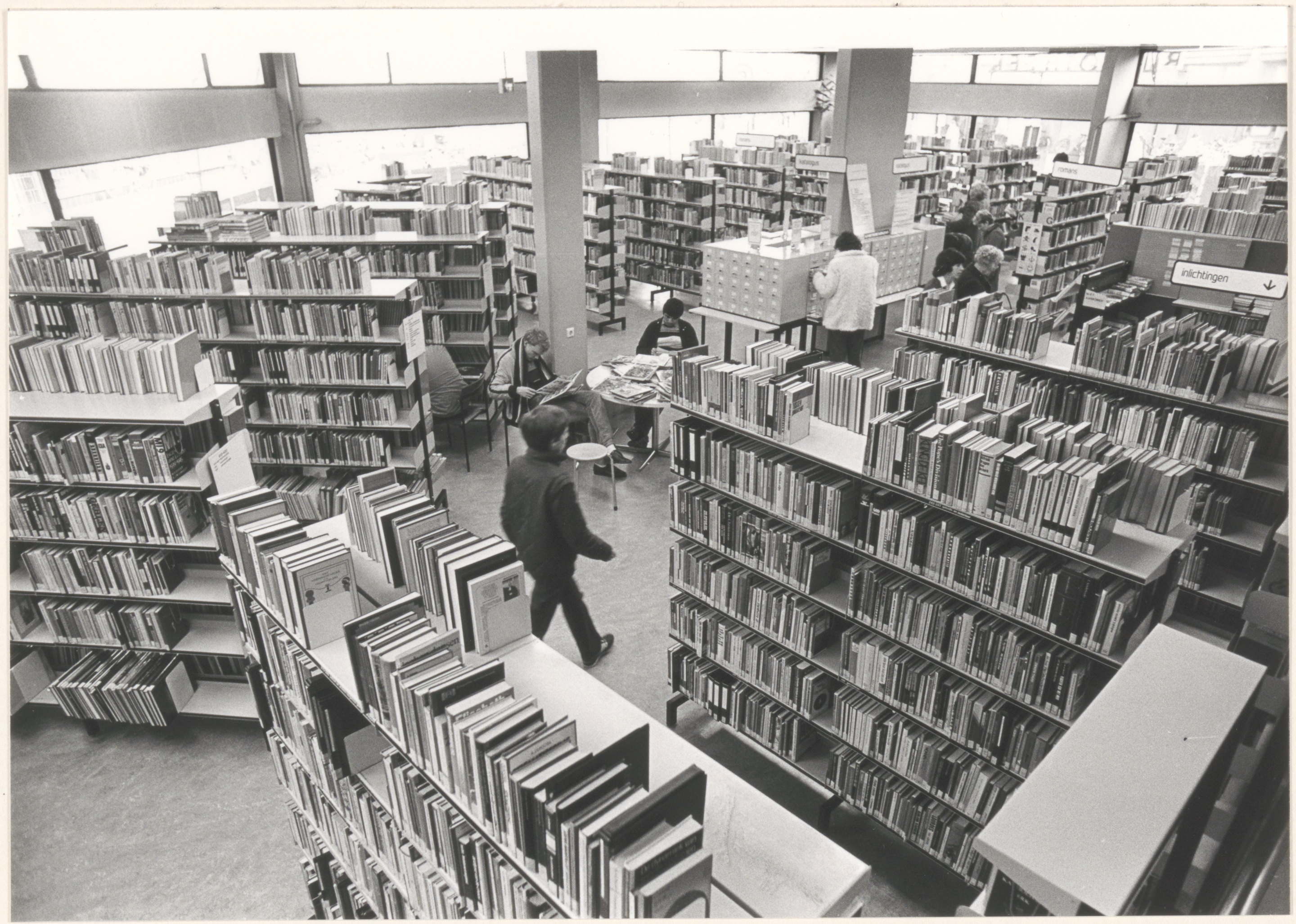 Publiek in de Openbare Leeszaal en Bibliotheek aan het Achterom vóór de verhuizing naar …