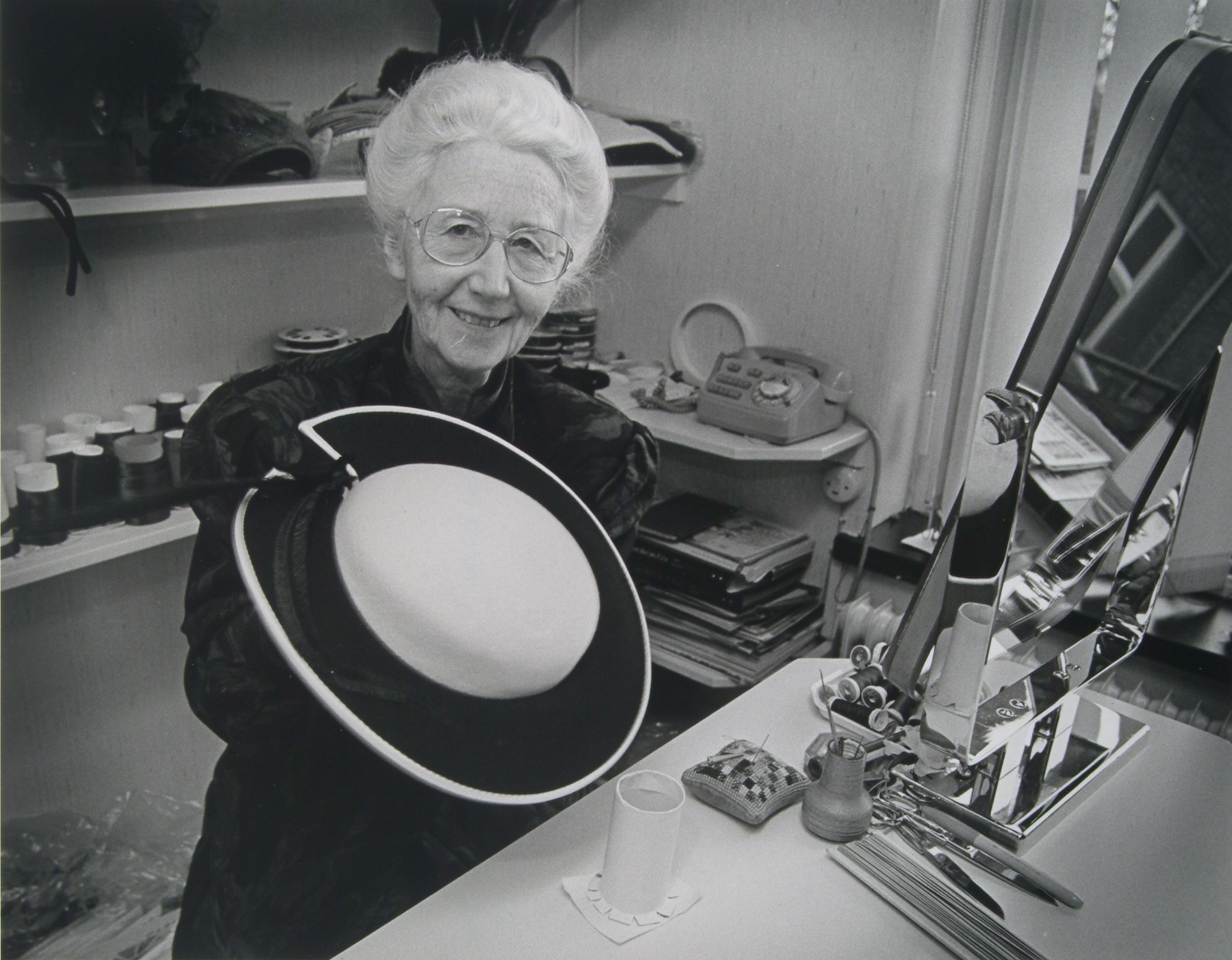 - Hoedenmaakster mevrouw W. Kraayeveld toont er één in haar atelier in Sliedrecht