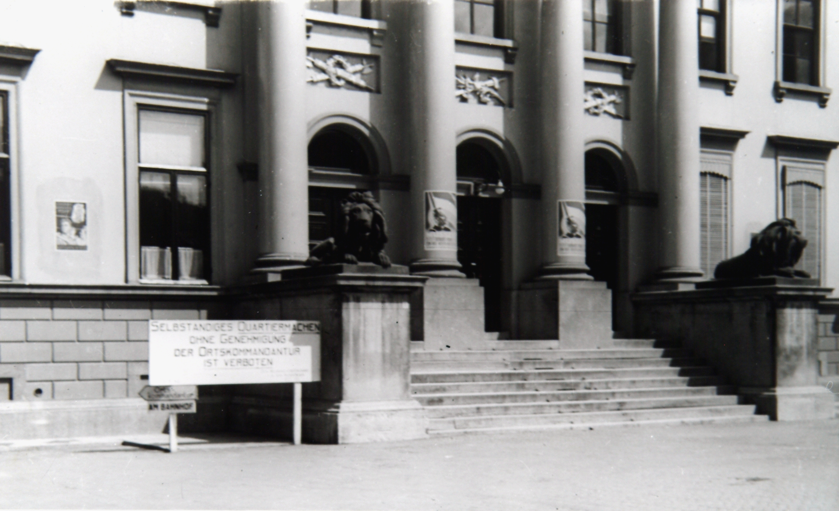 - Verkiezingspamfletten met de kop van Mussert zijn op het stadhuis geplakt. Het bord geeft aan, dat inkwartiering zonder toestemming van de ortscommandant verboden is.