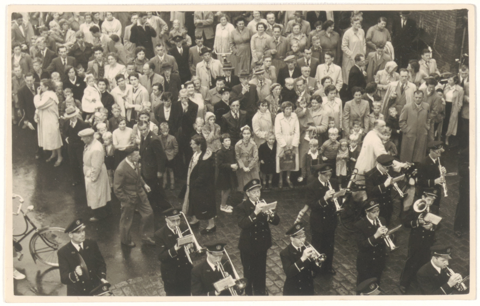 - Muziekkorps op de Groenmarkt bij de hoek van de Visbrug. Waarschijnlijk bij de viering van het 25-jarig jubileum van korfbalvereniging De Regenboog.