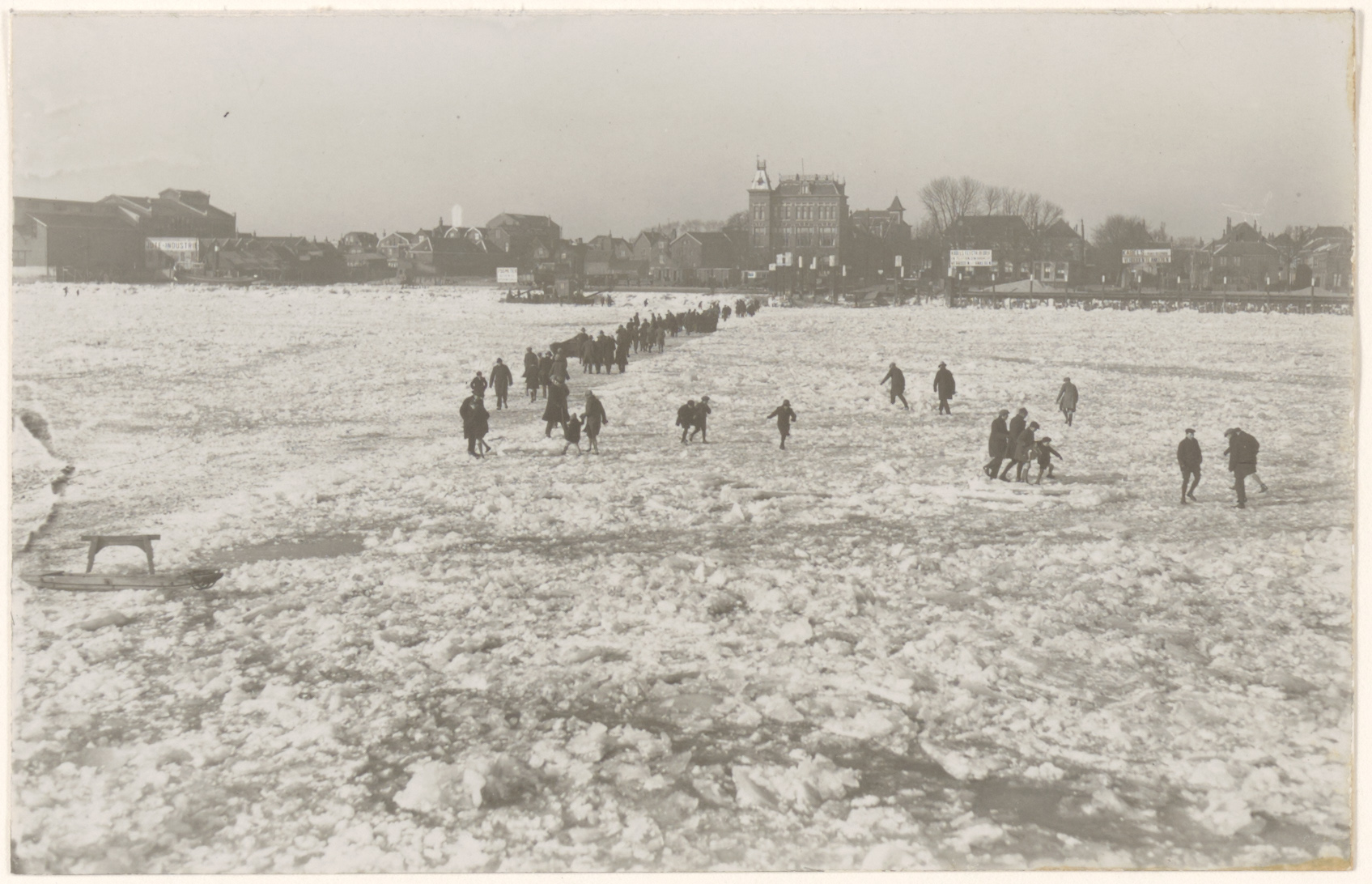 - Voetgangers tussen de steigers van het Zwijndrechts veer op de dichtgevroren Oude Maas tijdens de strenge winter van 1928/1929.