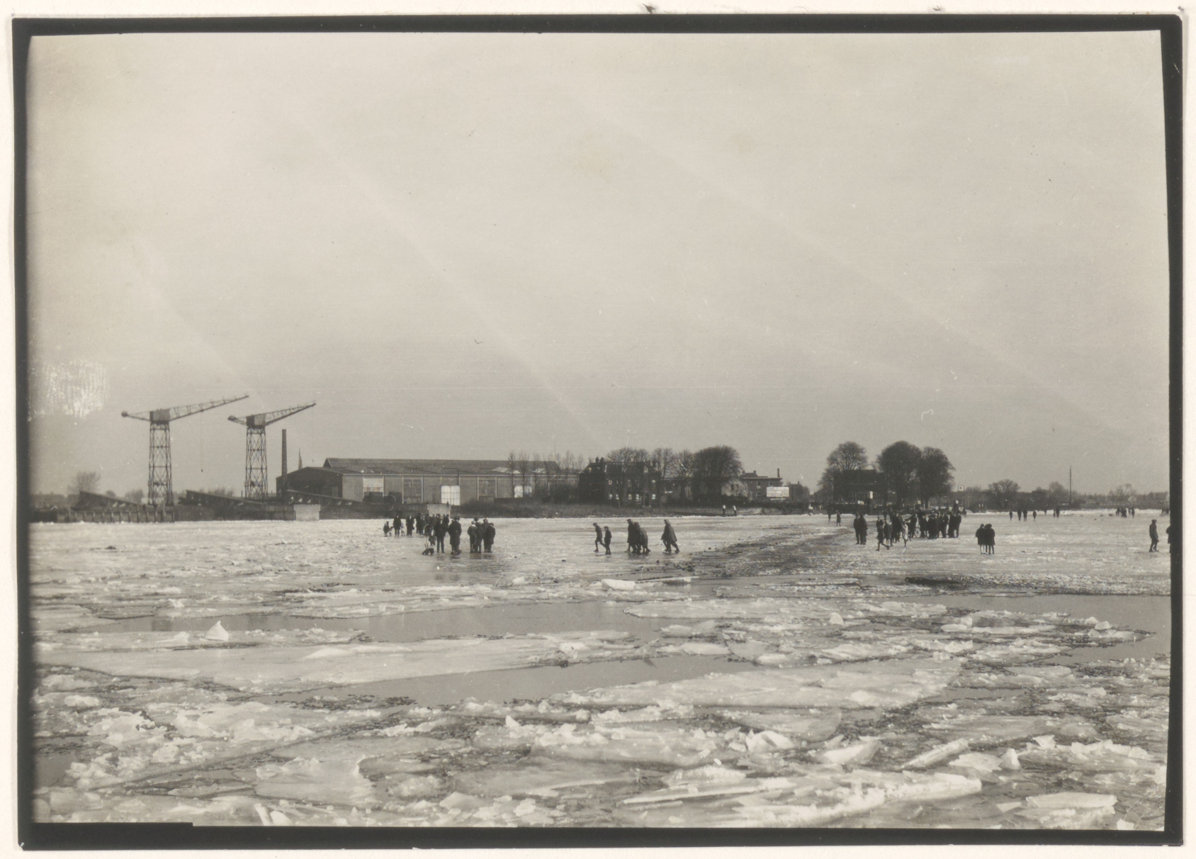 - Mensen op het ijs van de Beneden Merwede; op de achtergrond de Staart en rechts het Papendrechtse Veer; op de voorgrond is het ijs gebroken.