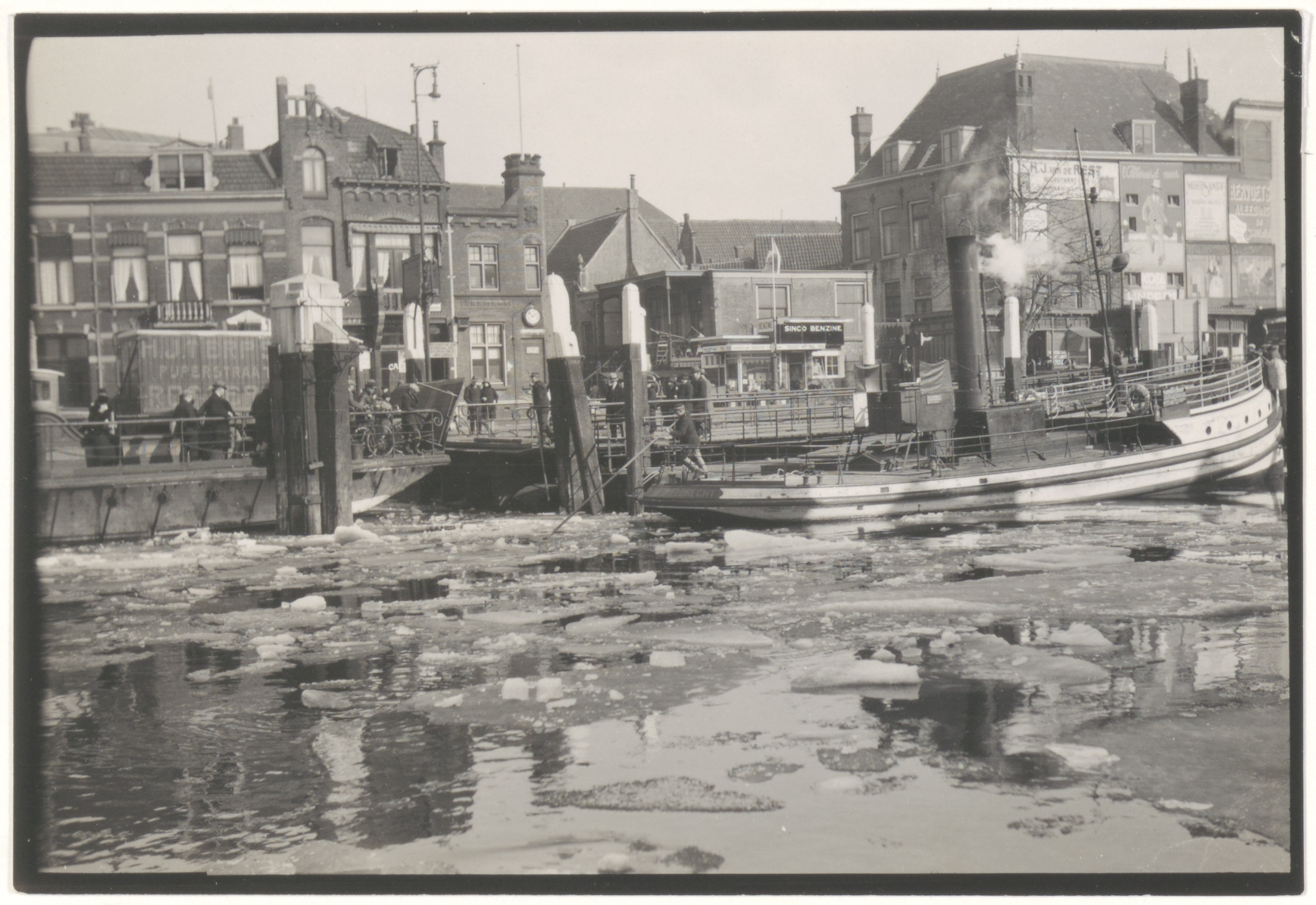- Het Blauwpoortsplein met de veerboot naar Zwijndrecht, gezien vanuit de achterkant van een huis aan de Korte Engelenburgerkade; er ligt wat ijs in de haven.