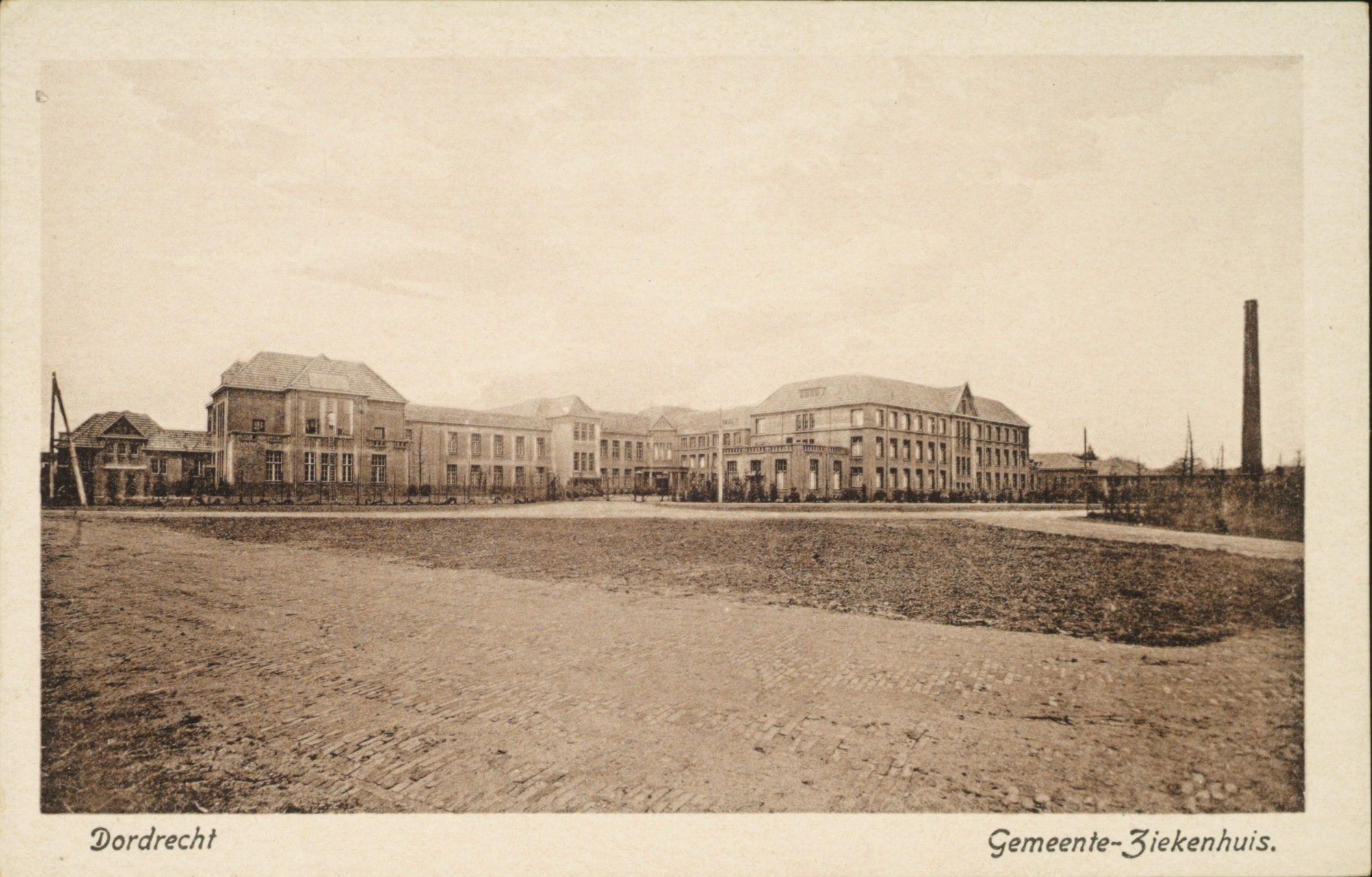 Het Gemeenteziekenhuis aan de Bankastraat. De schoorsteen is van het bij het ziekenhuis …
