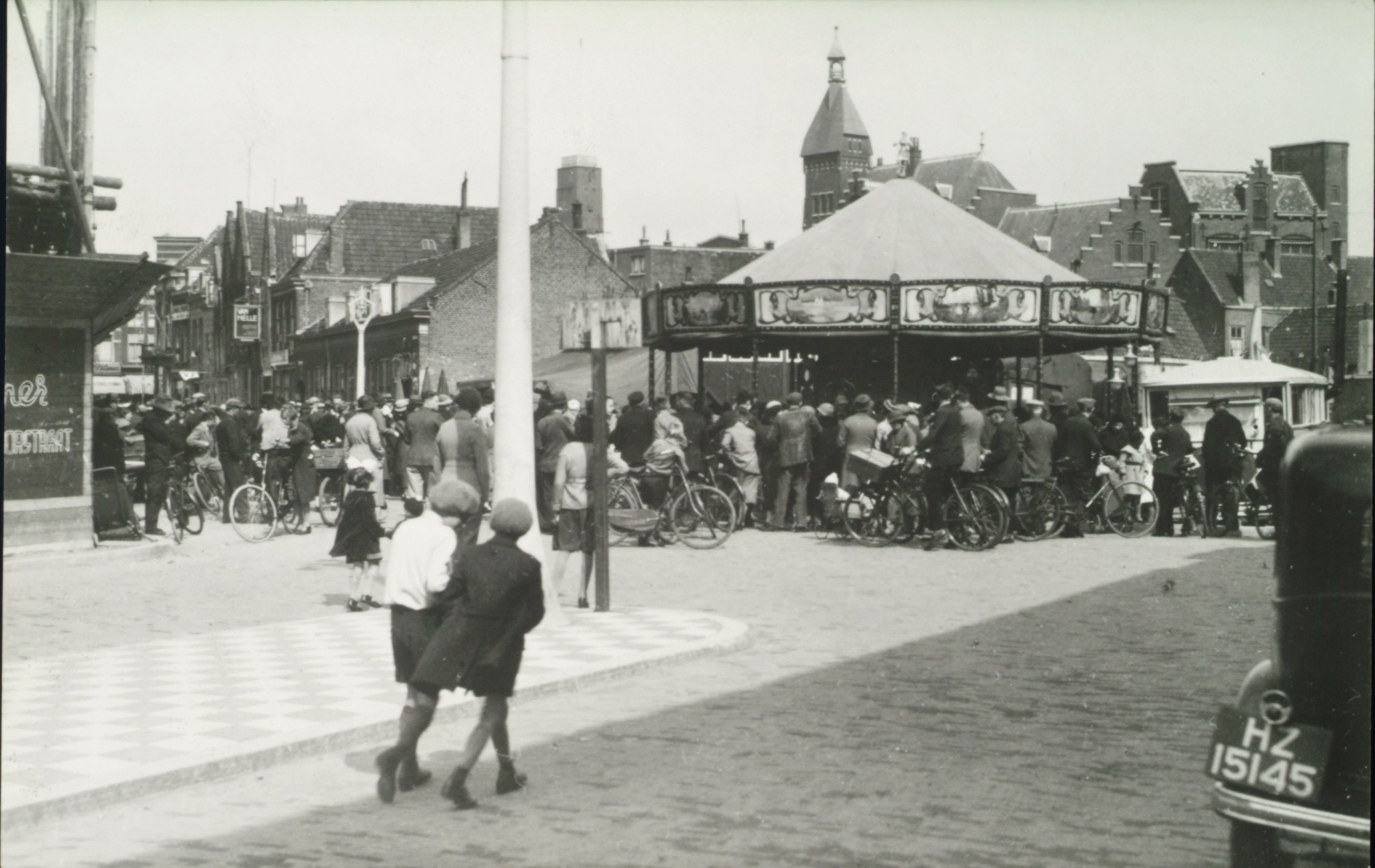 - Draaimolen op het Bethlehemplein in mei 1935 tijdens de DAWA week. Links de Raamstraat richting Bagijnhof. Op de achtergrond de torentjes van C&A en van het postkantoor.