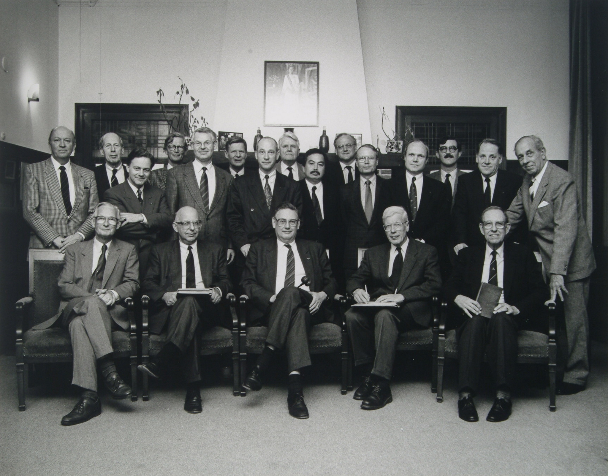 groepsportret van 20 van de 24 leden van het genootschap Diversa Sed Una op het Vlak bij het 175 jarig bestaan in 1991; gefotografeerd in sociëteit Amicitia aan het Vlak, waarop geheel rechts Mr. G.Th.A. baron van Lynden