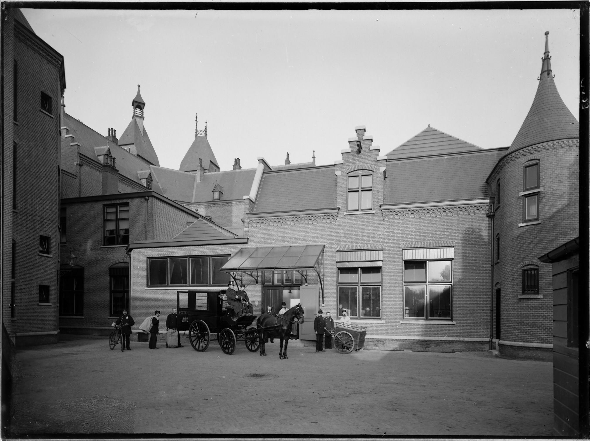 Binnenplaats van het postkantoor aan het Bagijnhof met personeel en het rijtuig waarmee …