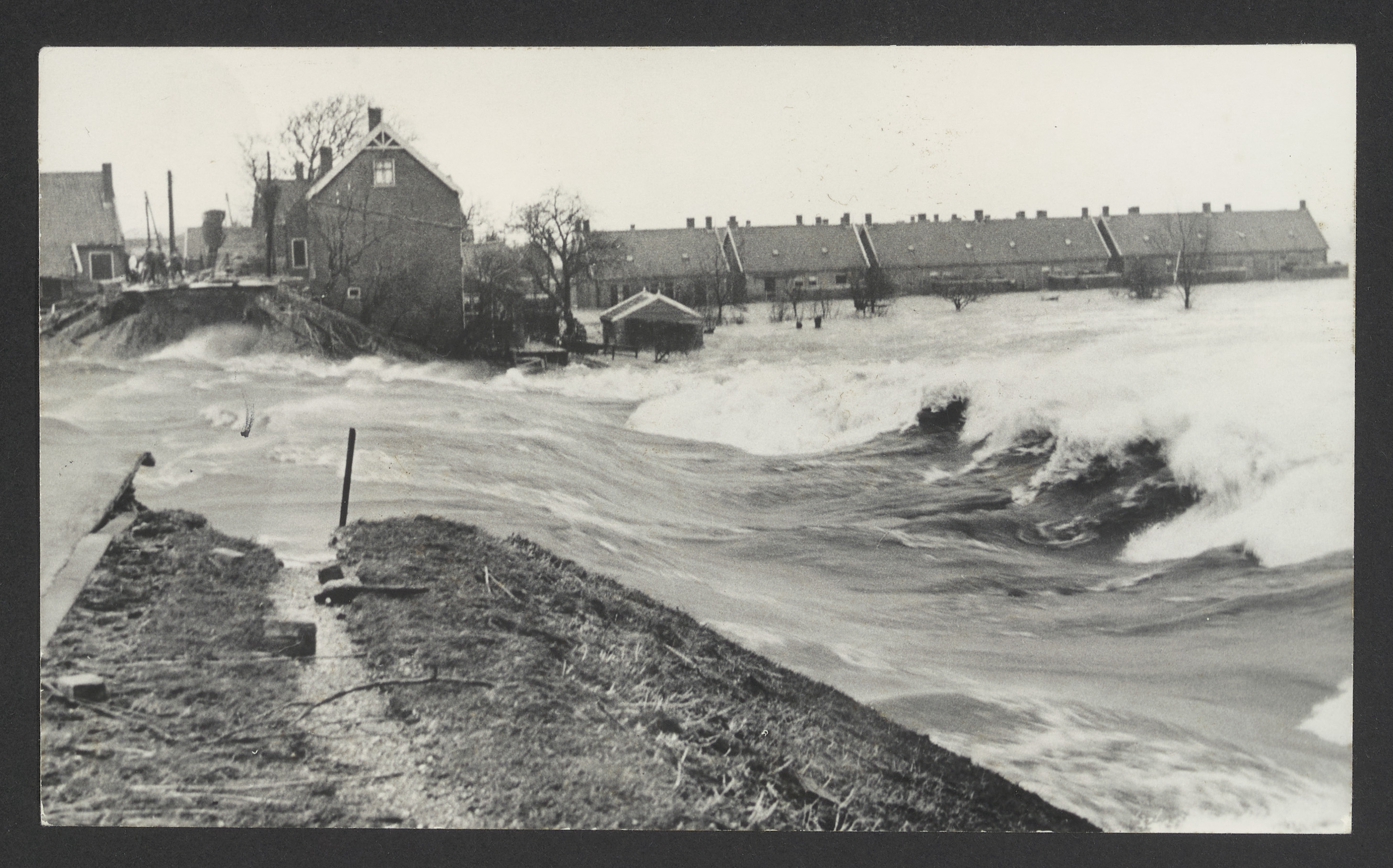 Dijkdoorbraak 1 februari 1953 op het Westeind. Op de achtergrond benedendijks de woningen aan de Eerste en Tweede Boezemsingel.