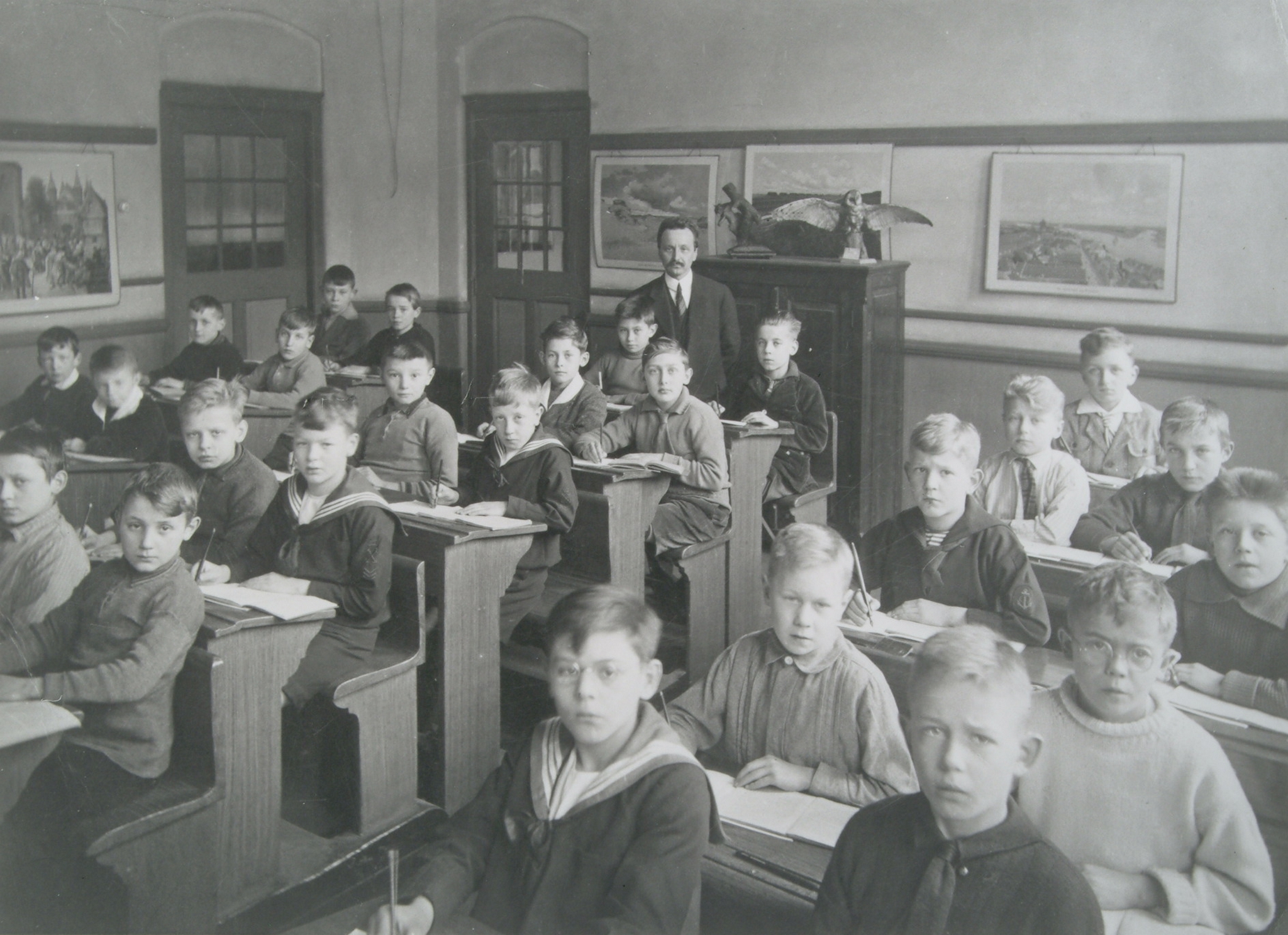 Jan Spierdijk achter in de klas rechts van de leraar (1915 geboren)
