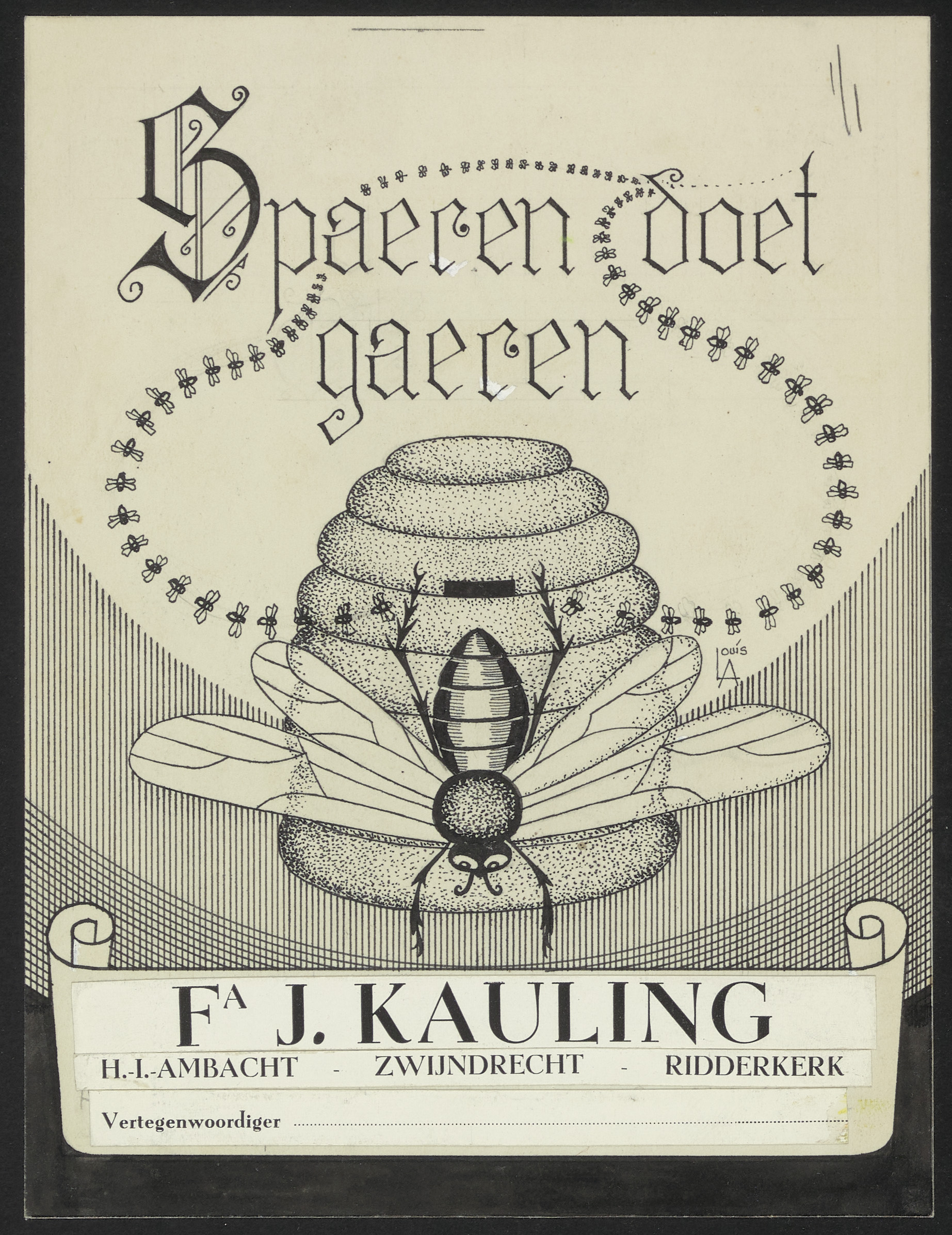 (reclame) Spaeren doet gaeren, fa. J. Kauling, Zwijndrecht, Ridderkerk, H.I. Ambacht (bijenkorf)