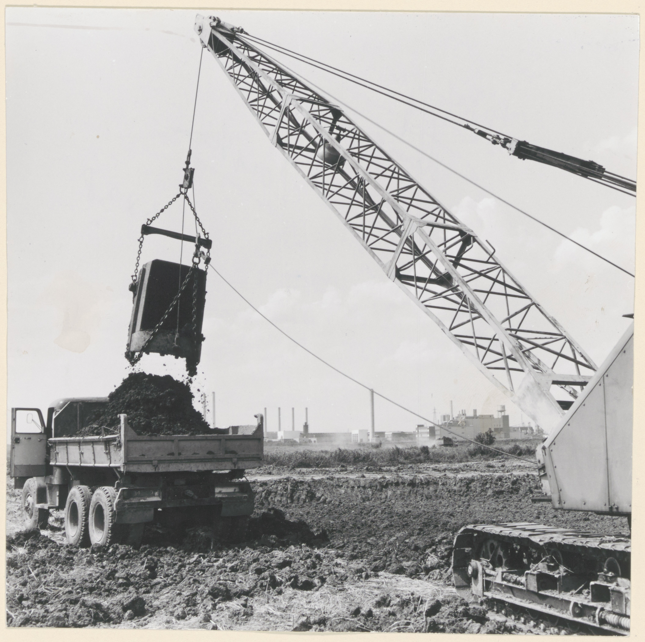 - Werkzaamheden in de Stadspolder met op de achtergrond de elektriciteitscentrale en de fabriek van Dupont de Nemours.