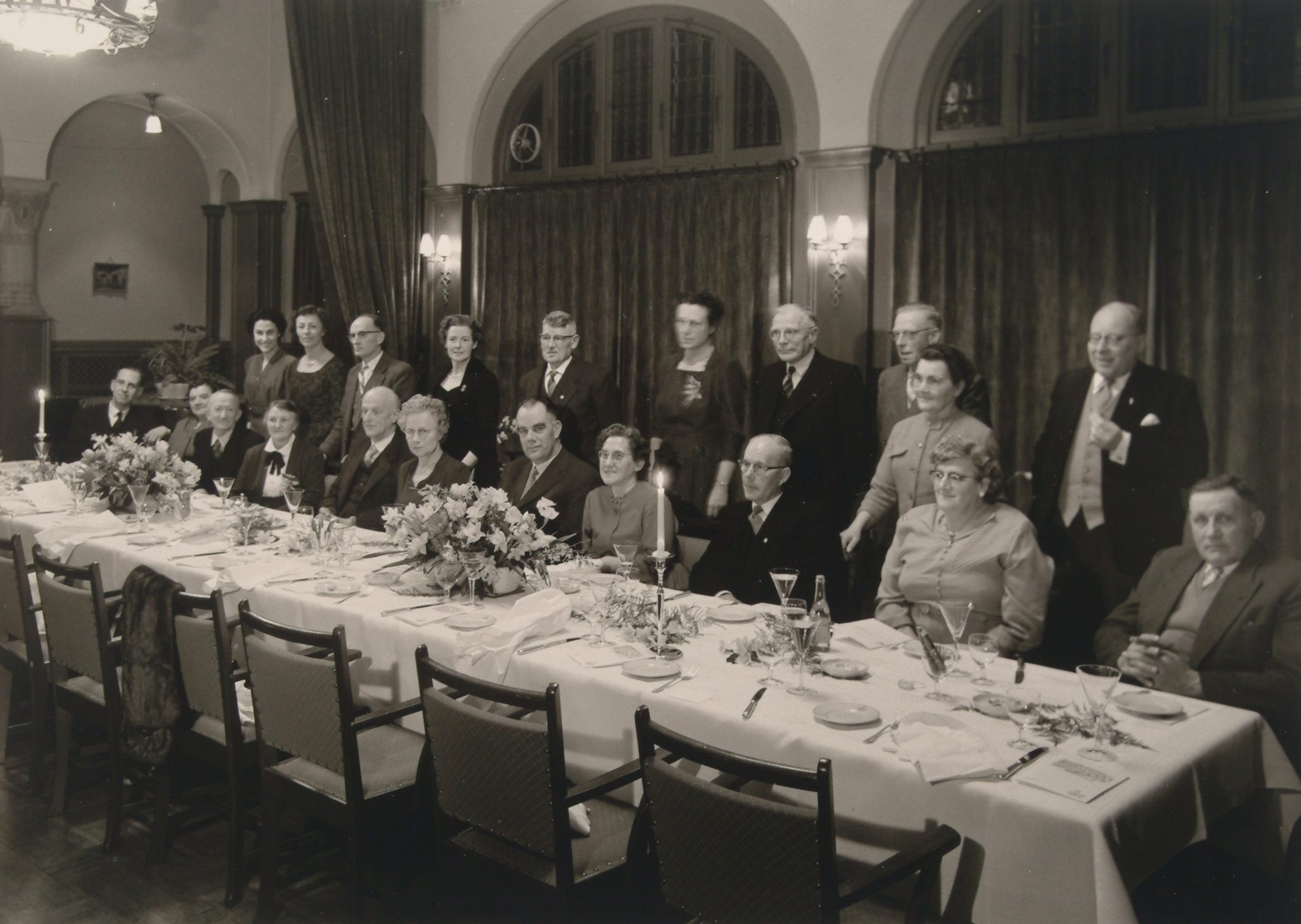 Bestuur met aanhang van het algemeen ziekenfonds afd. Dordrecht en Omstreken in hotel Ponsen t.g.v. het 25-jarig bestuurslidmaatschap van J.A. Bouma, R.T. Branbergen en J.P. Busink