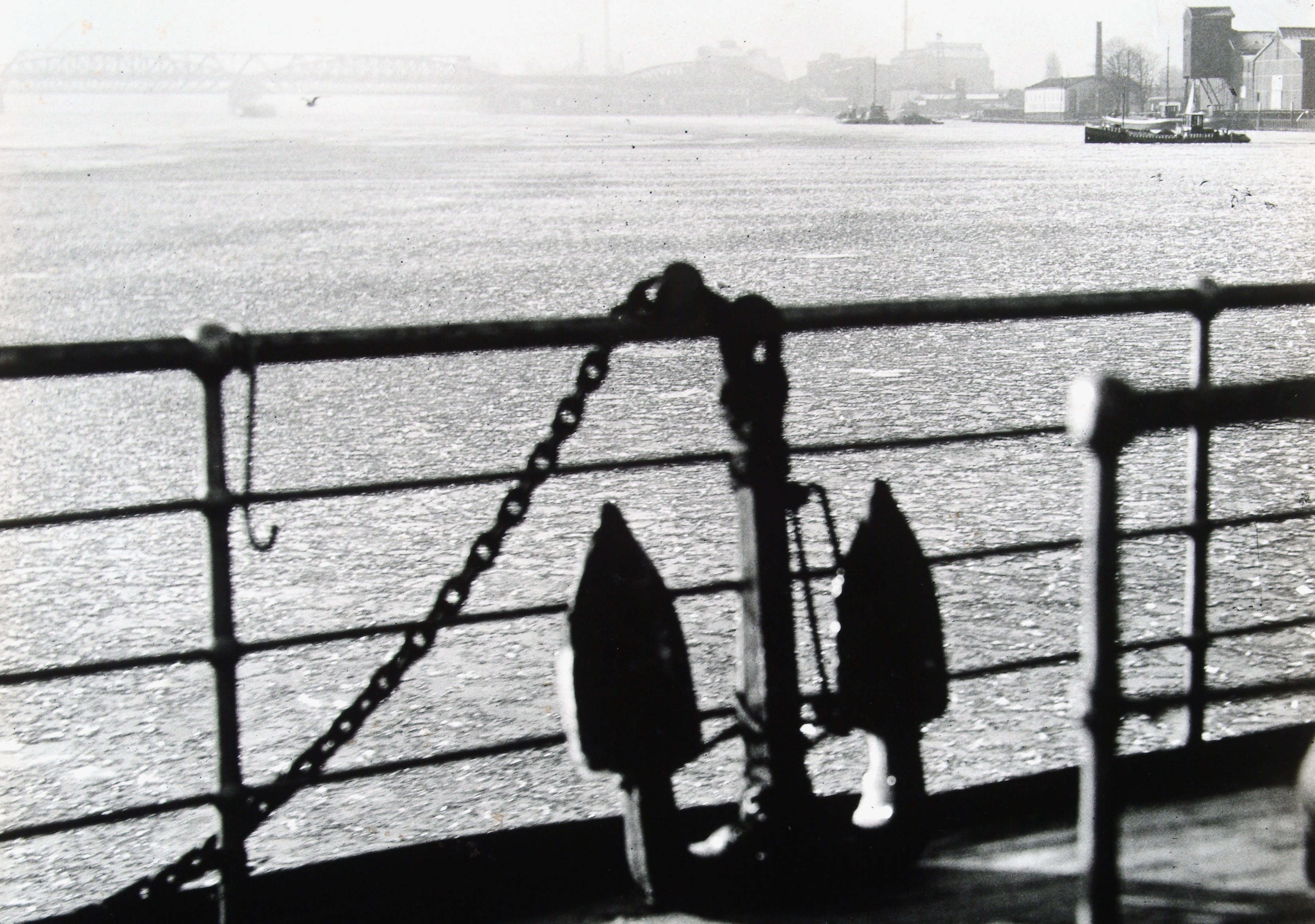 Oude Maas vanaf de Zwijndrechtse pont naar het westen, de spoorbrug vaag op de …