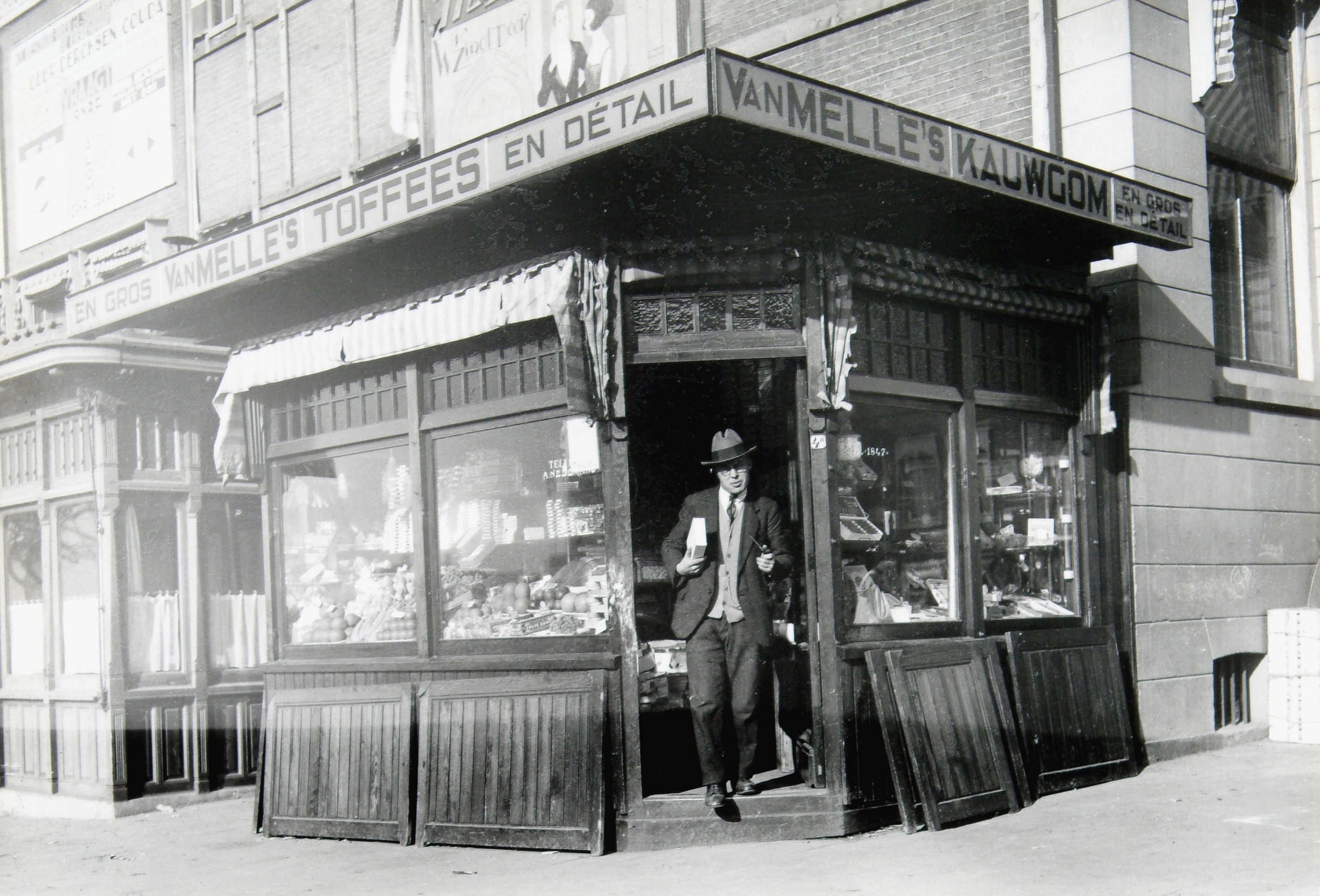 - De kiosken tegen de zijgevel van de Kweekschool met de Bijbel. Links de kiosk van de D.M.I. en rechts de fruitkiosk van A. Nelemans.