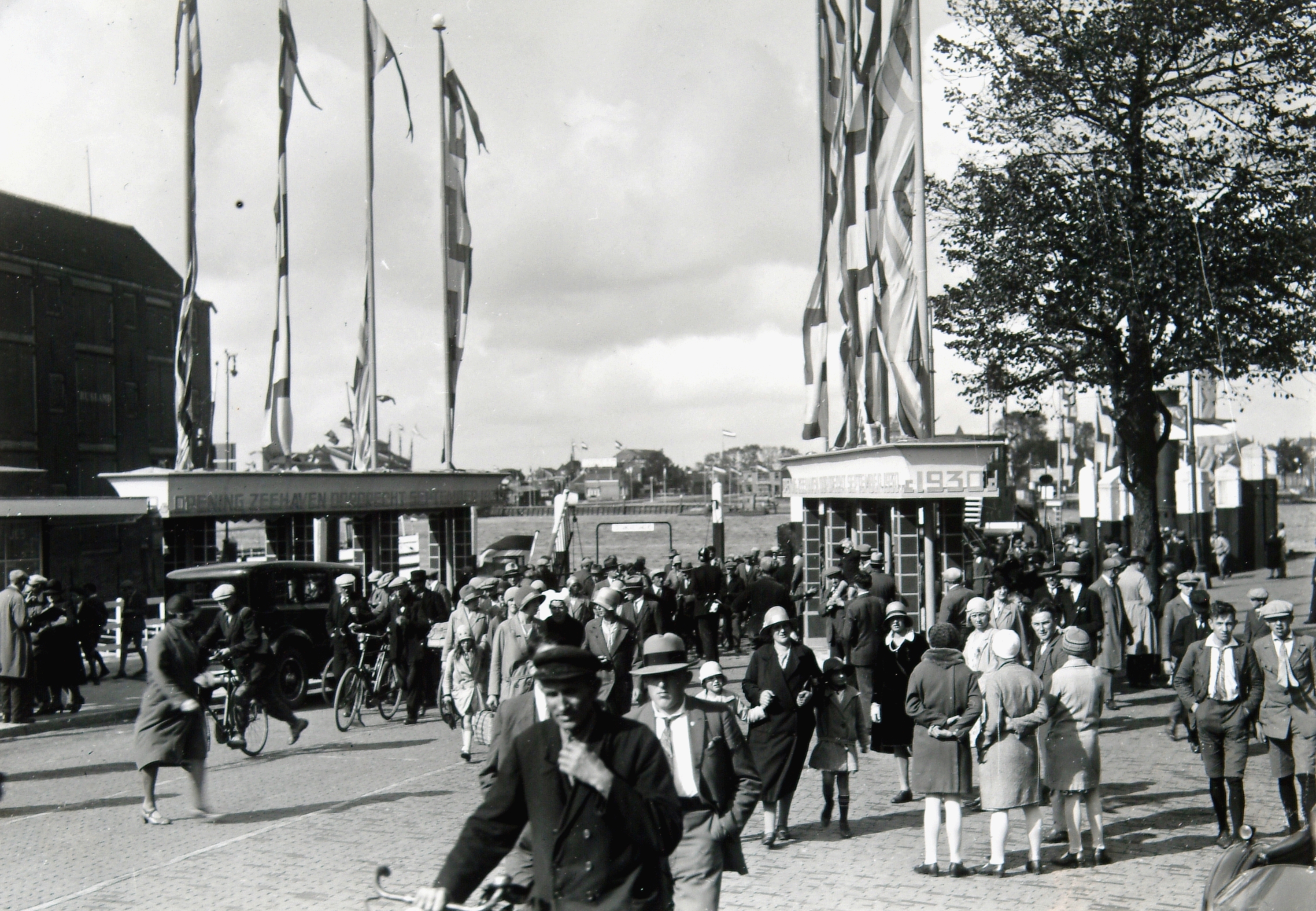 Drukte op het Blauwpoortsplein na aankomst van het veer uit Zwijndrecht. Ter gelegenheid van de opening van de Zeehaven is het plein versierd met vlaggen en een erepoort.