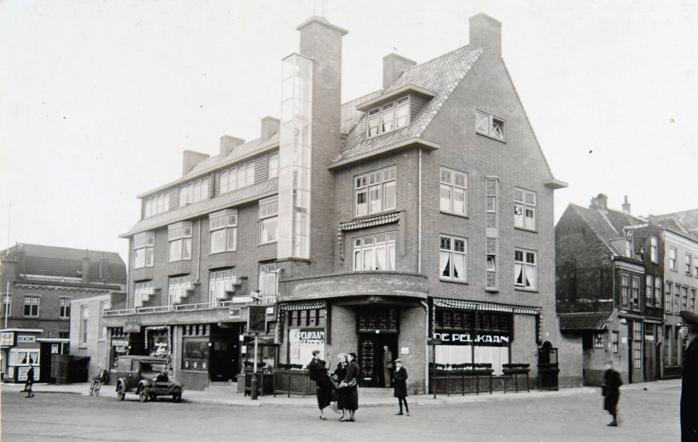 Gezicht op café De Pelikaan, winkels en woonhuizen die op de plek van de vroegere …