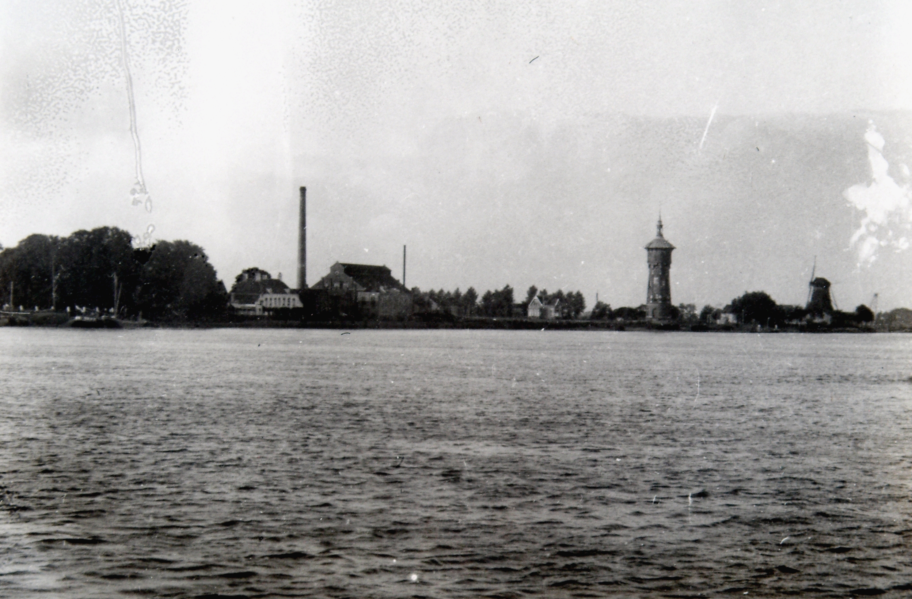 Gezicht op Zwijndrecht over de Oude Maas naar het veer en de hoek bij de Noord met de watertoren en molen Welgelegen.