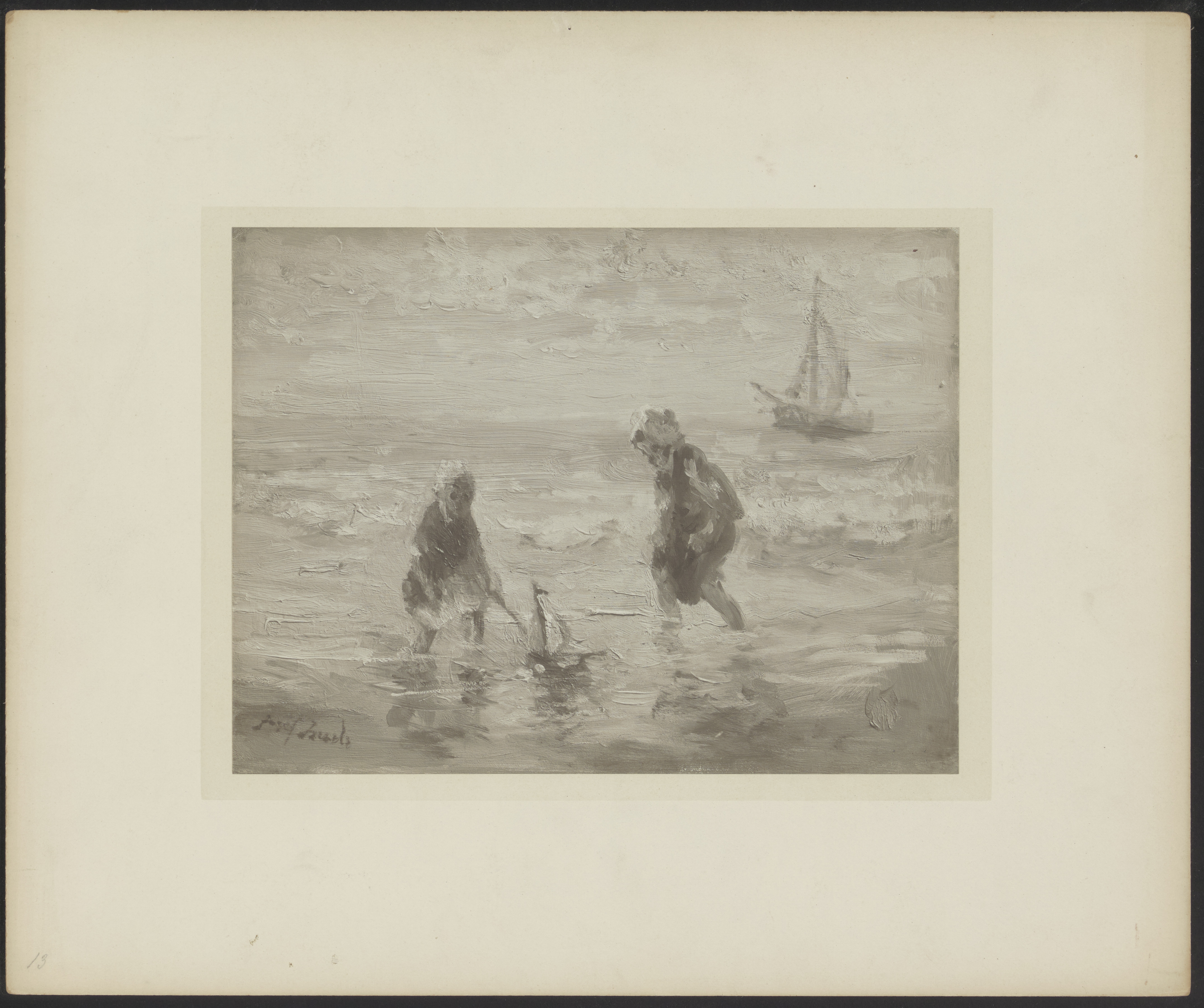 Zwart wit opname van het schilderij “Kinderen der Zee” of “Kinderen van de zee”, Jozef Israels, 1911. Nu in de collectie van het Dordrechts Museum. https://data.collectienederland.nl/page/aggregation/rijkscollectie-rce/AB9276