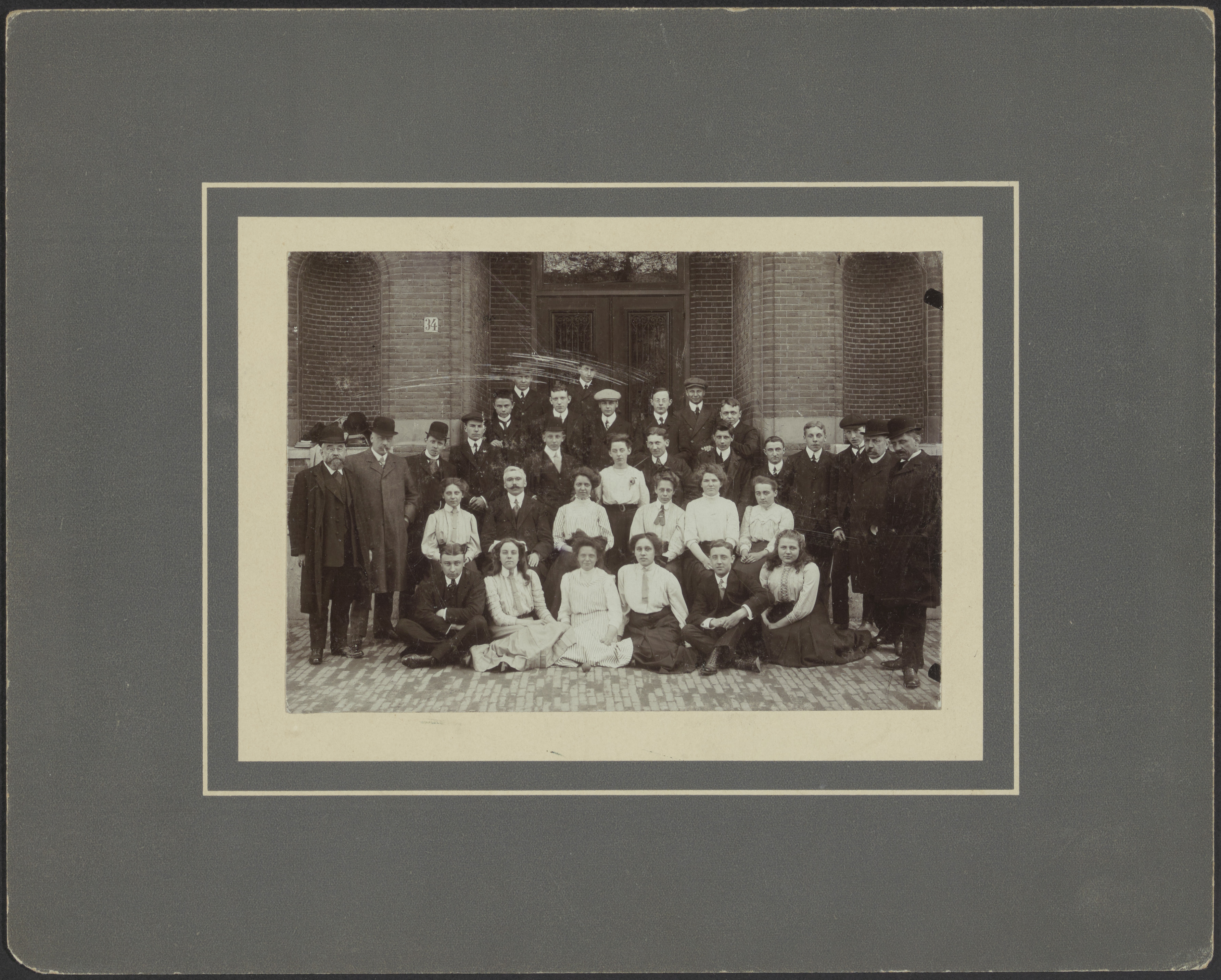 Identiek aan 552_300379: Mei 1910, leerlingen en docenten voor de ingang van het gymnasium aan de Cornelis de Wittstraat. V.l.n.r. bovenaan: L. Nugteren, D.J. v.d. Graaf. Achterste rij: W. Ode, A. Dijckmeester, L. Roodenburg, B.N.B. Boulhoorn(?), H.M.A.C. Feijkes, J.P. van Heest. 3e rij: leraar Van Entz, E. Schotman, V. Wichers, M.E. Brandts, G.C. Hoolmans, D.M. Langeveld, P. Welcher, H. van Werkum, H. Dijkstra. 2e rij: Dr W.J.M. van Stockum, Dr B. van Rijswijk, W. Vos, L. Molenaar (leraar), M. van Bruggen, M. Bloembergen, N. Boele, Bergmeyer. Rechts opzij staand: R.J. Dalhuisen en Dr A. Opprel. 1e rij: J.Th. Flohil, J.M.C. Bouvy, C.J. van Bruggen, J.P. Luyt, Corneille ‘Kees’ Vriesendorp (22 september 1891-), A.C. Bosch.