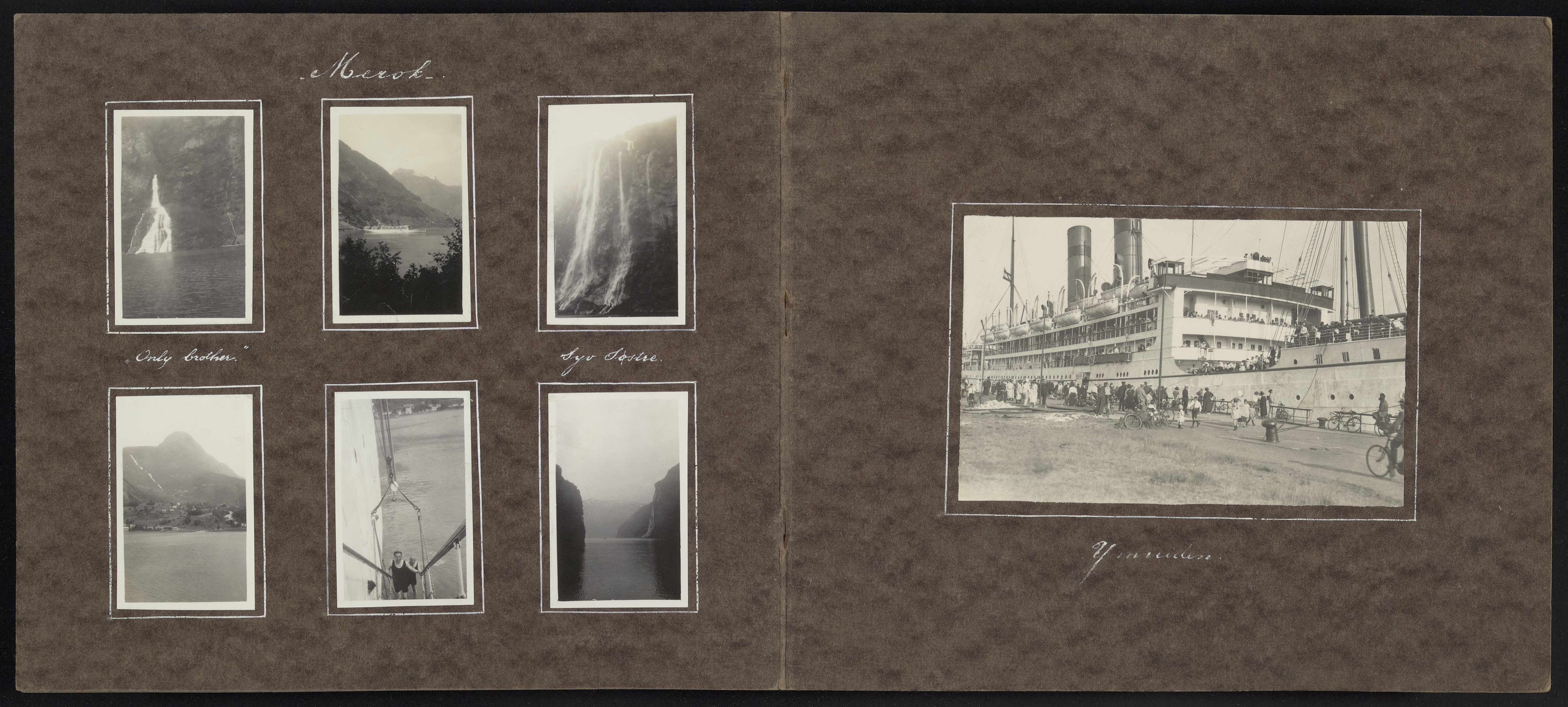 S.S. Gelria van de Koninklijke Hollandsche Lloyd, reis naar de Noorse fjorden, (vanaf) 15 juli 1925. Links Merok, of meer correct de Noorse naam Maråk. Dit is een boerderij en omliggend gebied bij het plaatsje Geiranger in Noorwegen met langs de Geirangerfjord de watervallen De Zeven Zusters en de Broeder er tegenover. Rechts de Gelria aan de kade in IJmuiden.