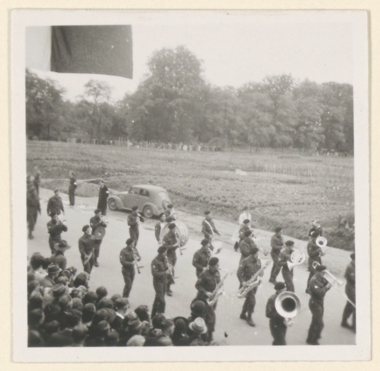 - Een Canadees muziekkorps tijdens de bevrijdingsmars op de Krispijnseweg.