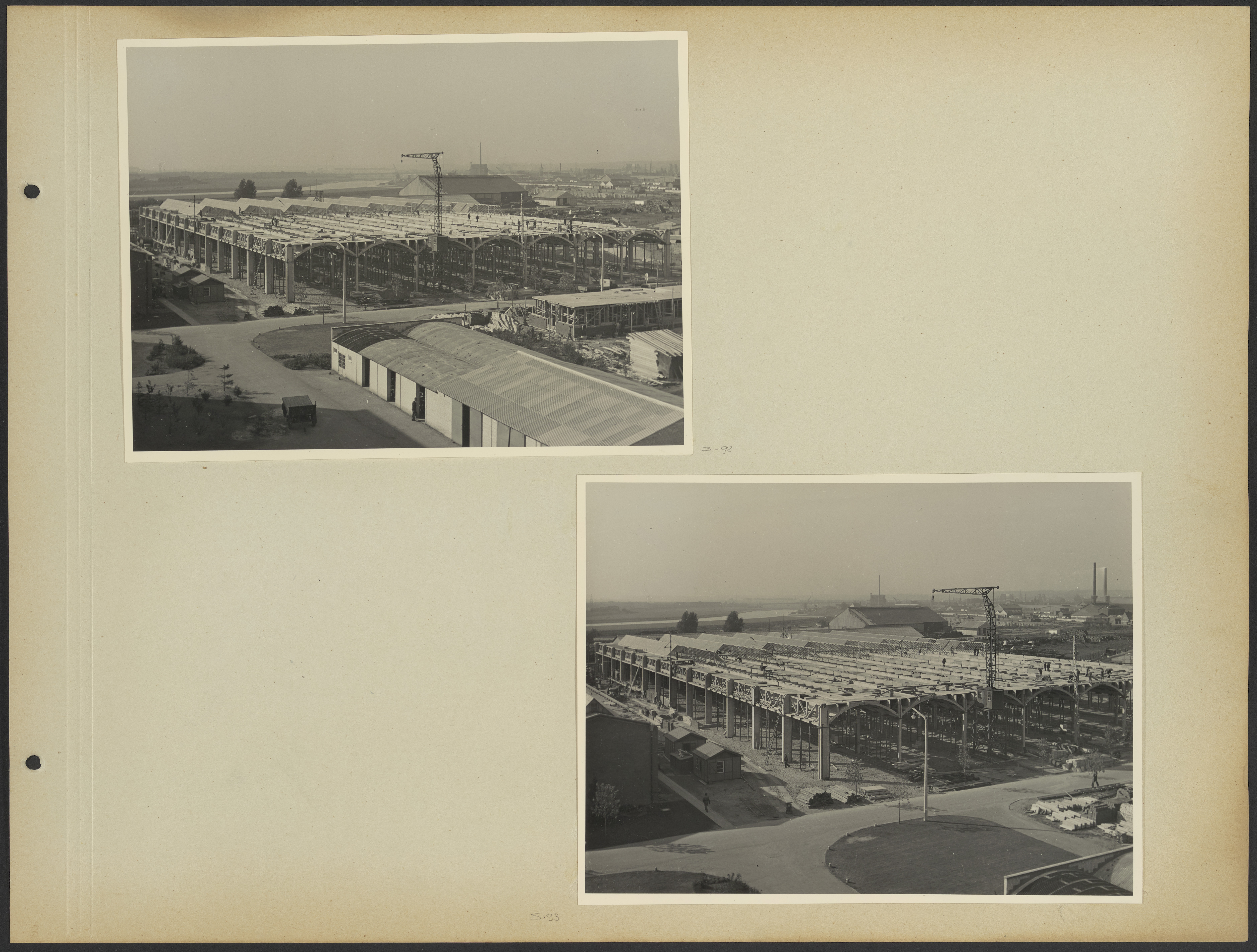 Bouw van de rayon-spinnerij van AKU aan de Westervoortsedijk in Arnhem. De Nederrijn op de achtergrond.