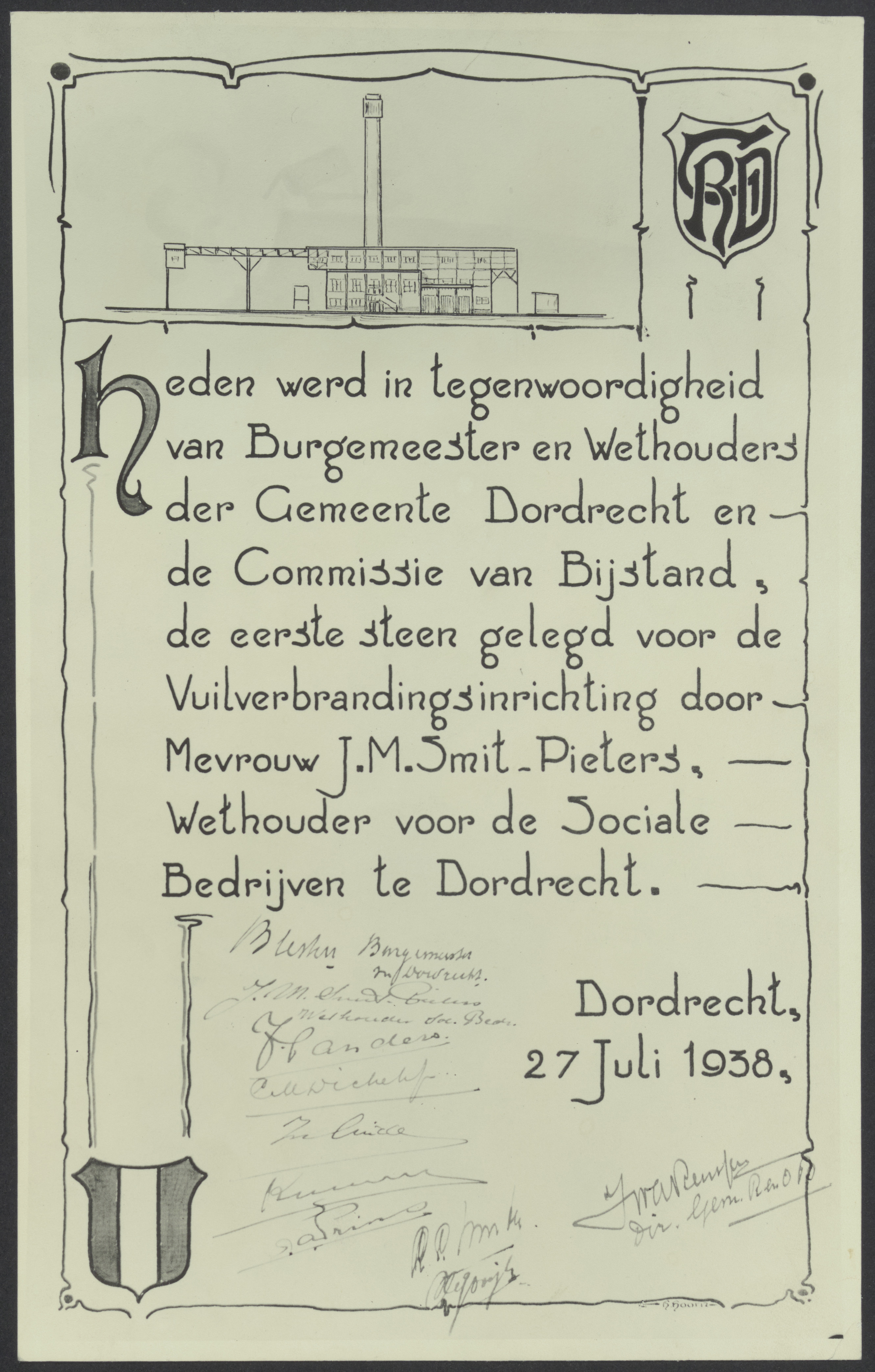 [oorkonde, H. Hoorn] eerste steen gelegd voor de Vuilverbrandingsinrichting door Mevrouw J.M. Smit-Pieters, wethouder, 27 Juli 1938 (Bleeker, Sanders, Dicke)