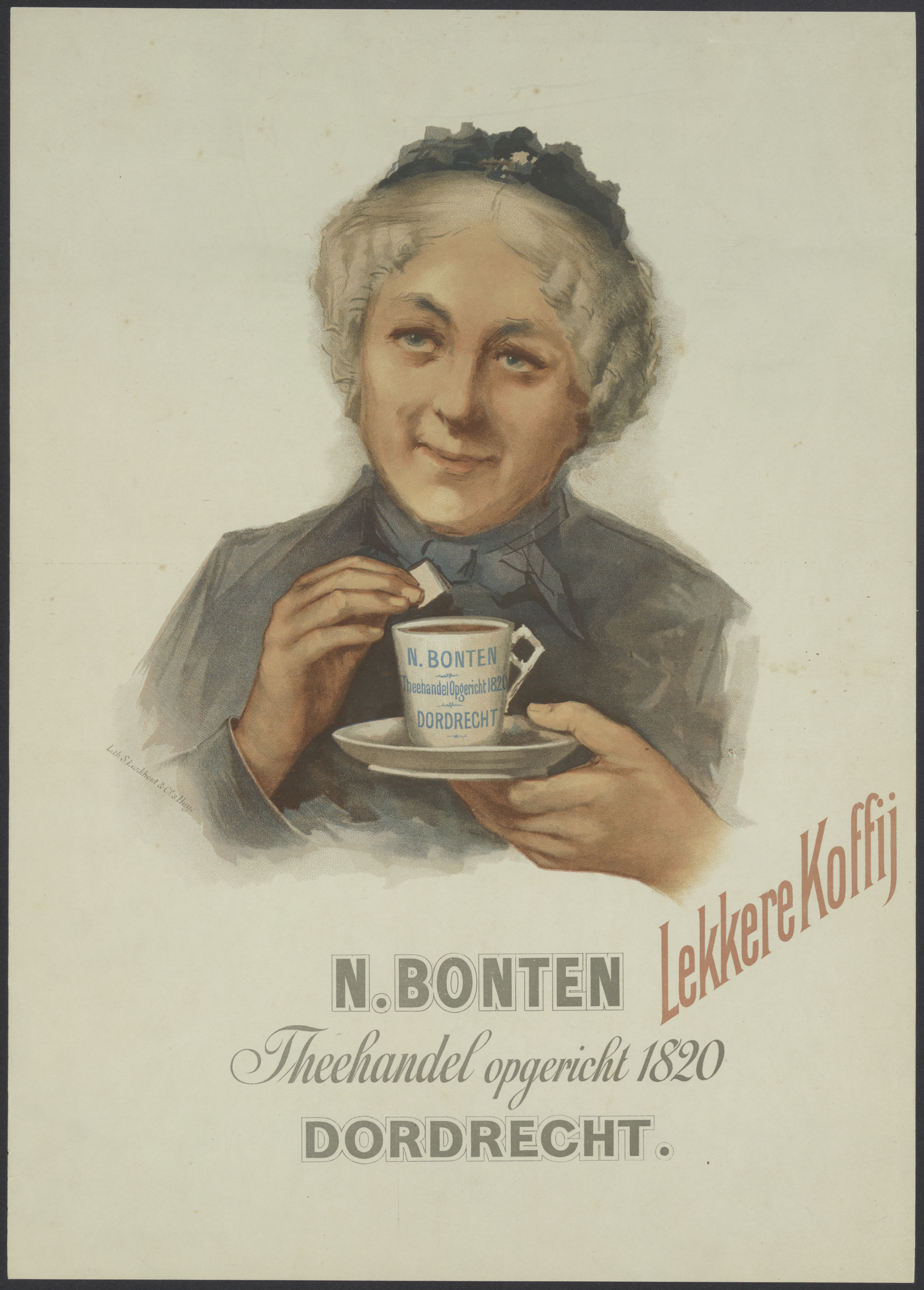 (lith. S. Lankhout & Co, 's Hage) vrouw met kopje koffie ----- N. Bonten, theehandel opgericht 1820, Dordrecht, lekkere Koffij