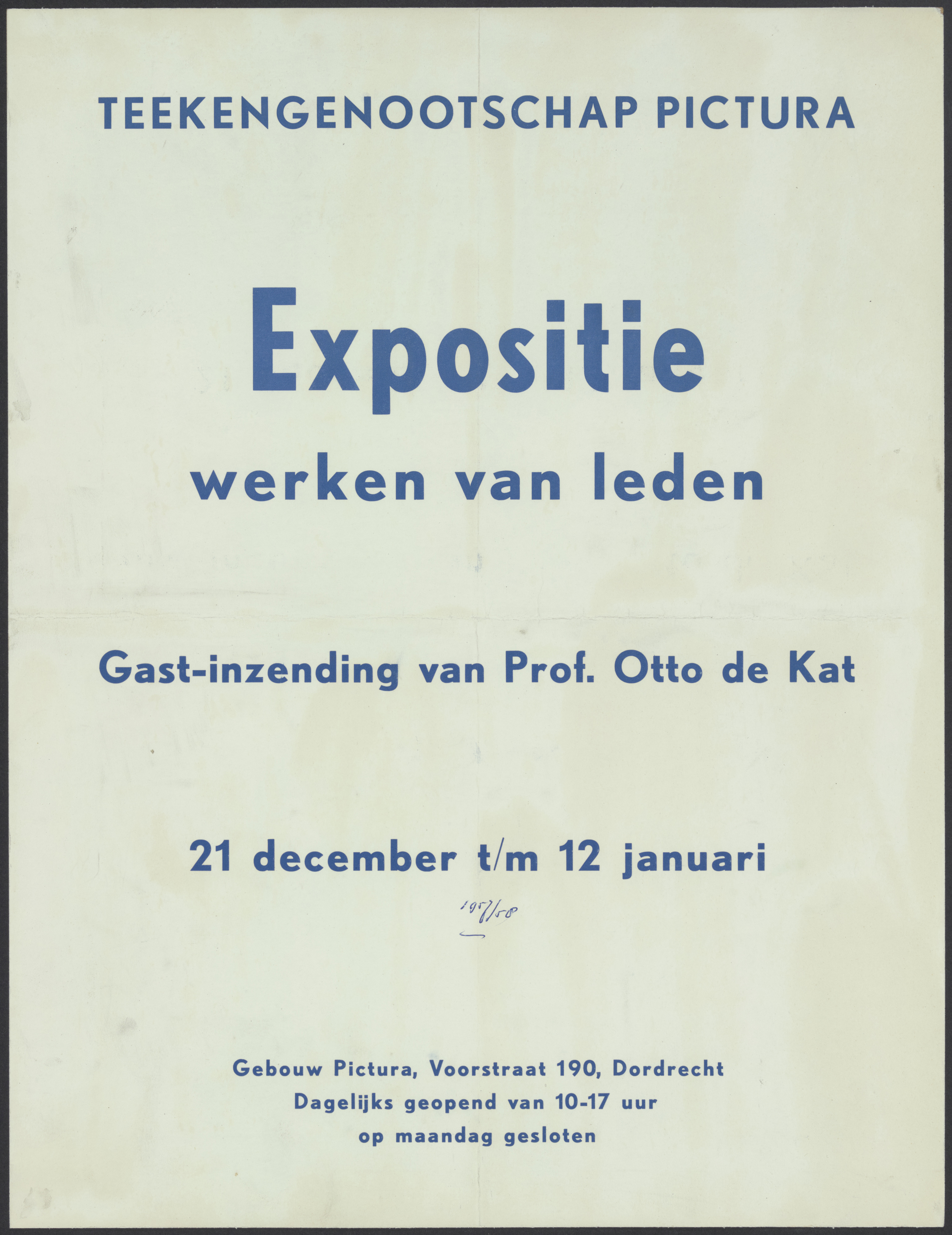 (affiche) Teekengenootschap Pictura Expositie werken van leden, gast-inzending Prof. Otto de Kat, 21 dec 1957 - 12 jan 1958, Gebouw Pictura Voorstraat 190