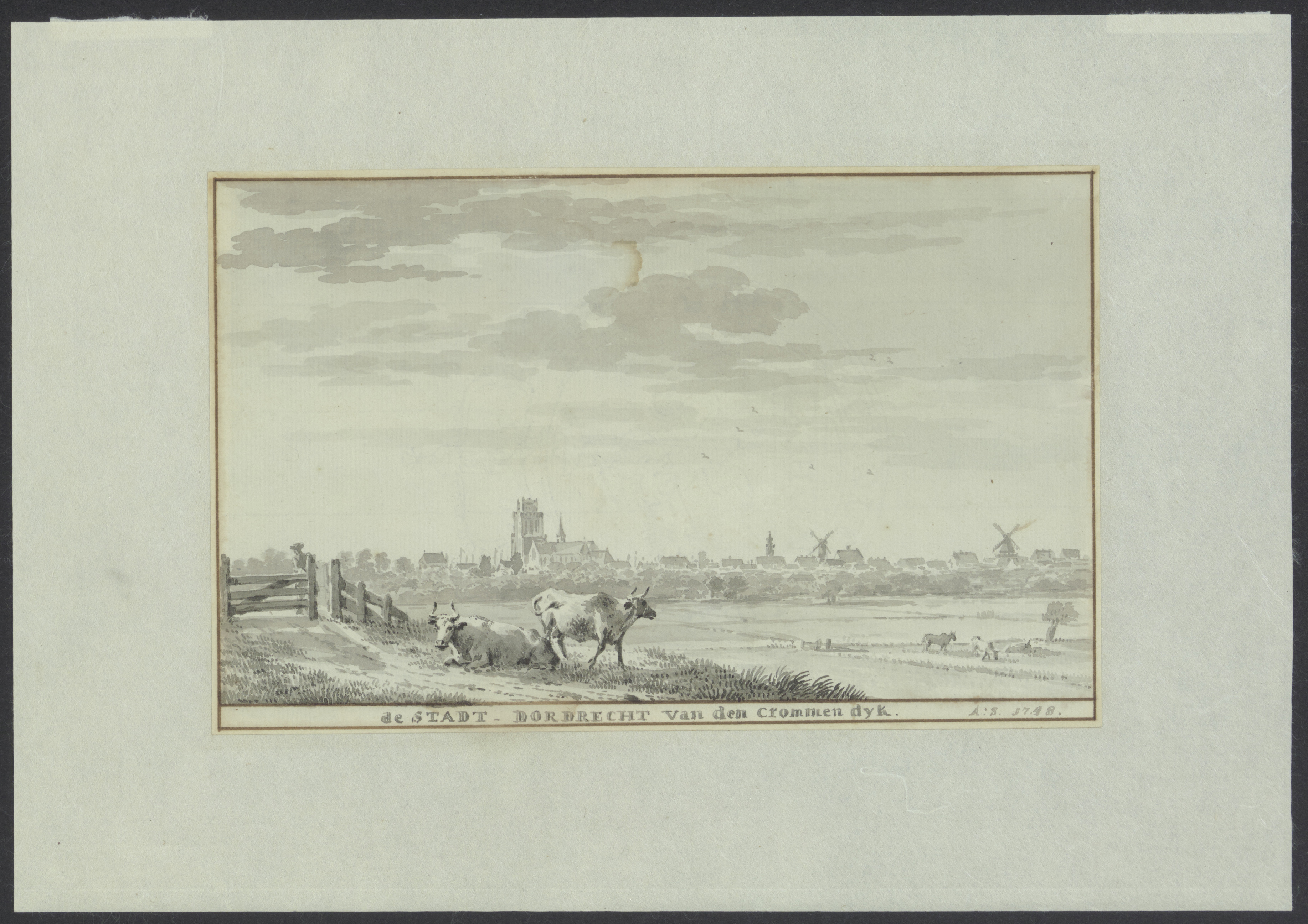 Tekening door Aert Schouman van Dordrecht gezien vanaf de Krommedijk. Links molen De …