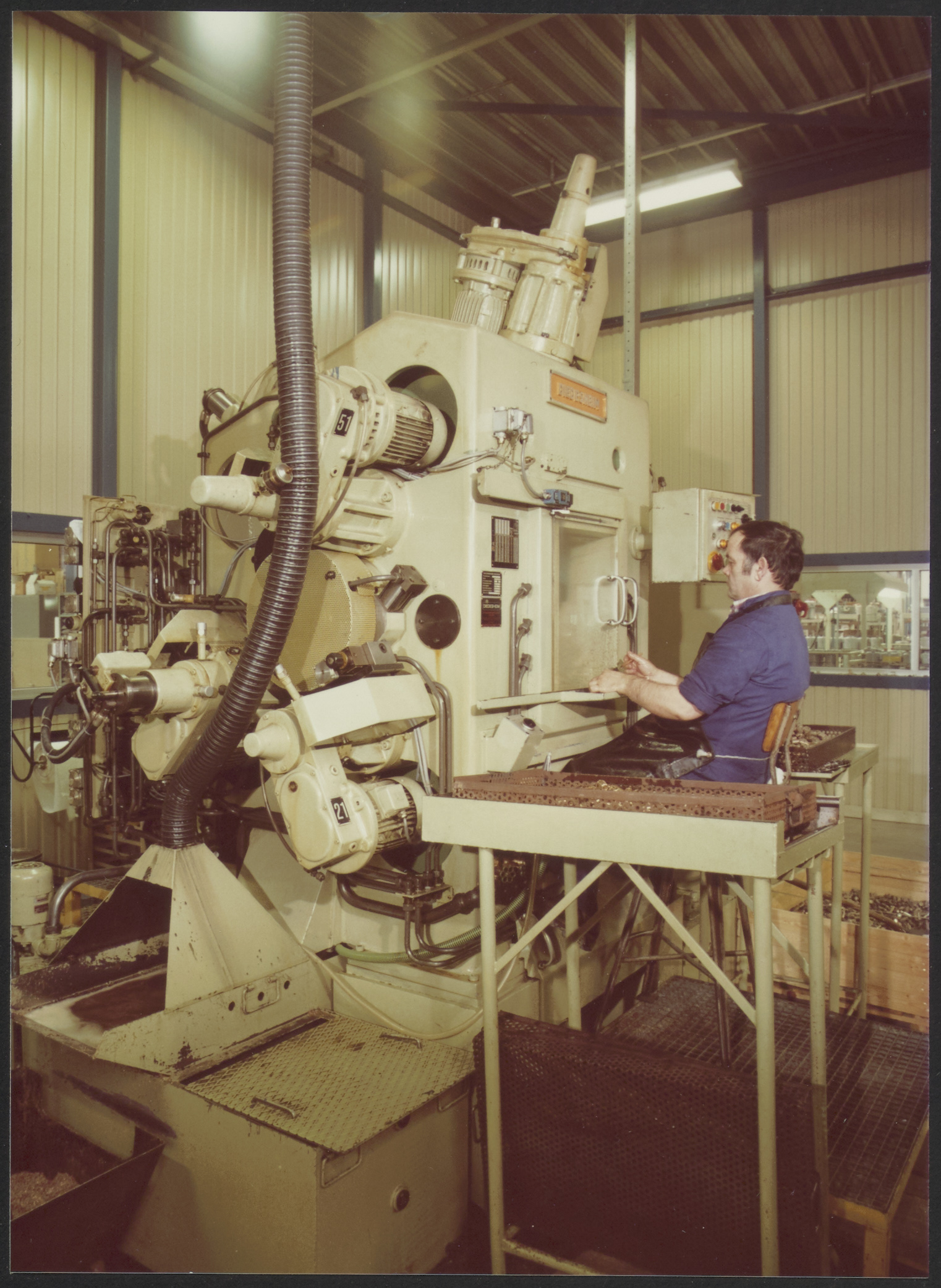Minder expliciet, maar gezien de voorgaande beelden: productie van onderdelen voor gasmeters bij Meterfabriek Schlumberger aan de Kamerlingh Onnesweg, hoek Helmholtzstraat