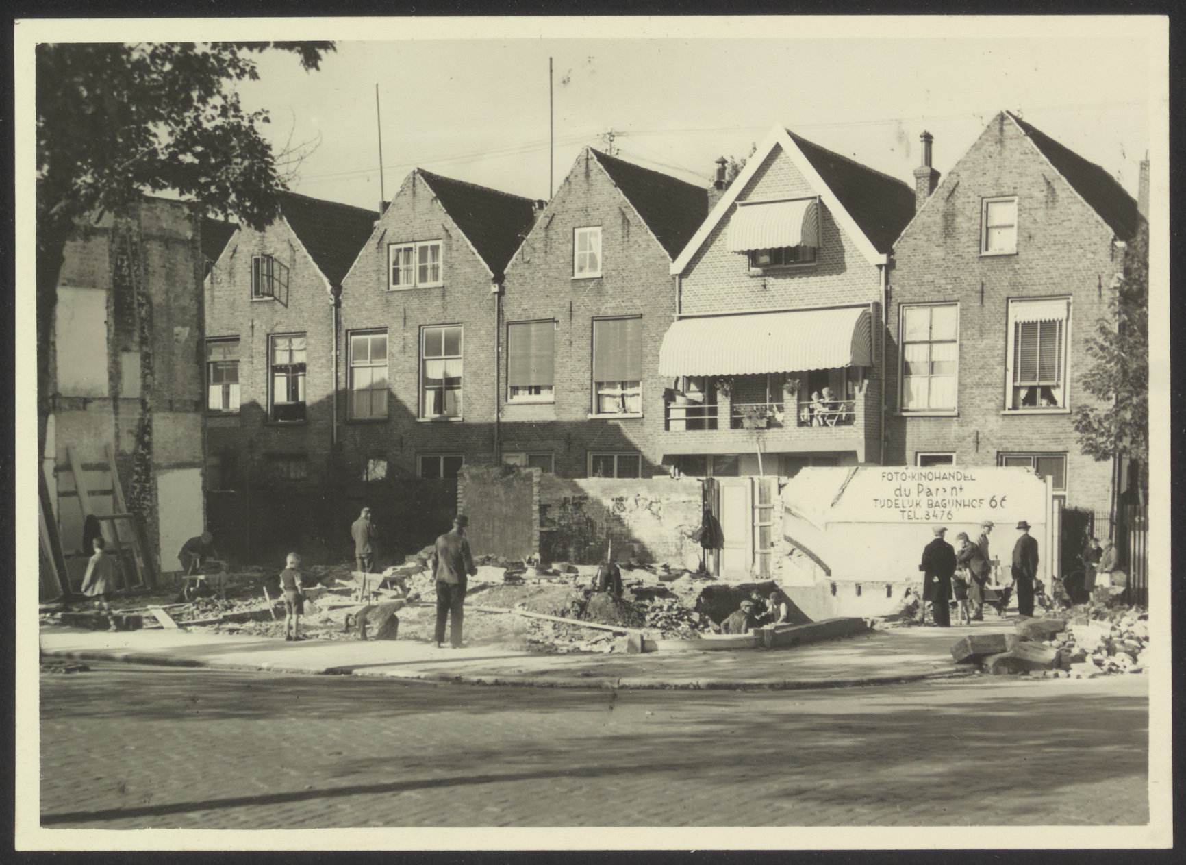Op de achtergrond, het huis met de zonneschermen, in de Muys van Holystraat, was de noodwinkel van v. Donkelaar. Op de andere foto's is nog niet te zien dat het huis aan de M.v. Holystraat verbouwd is.