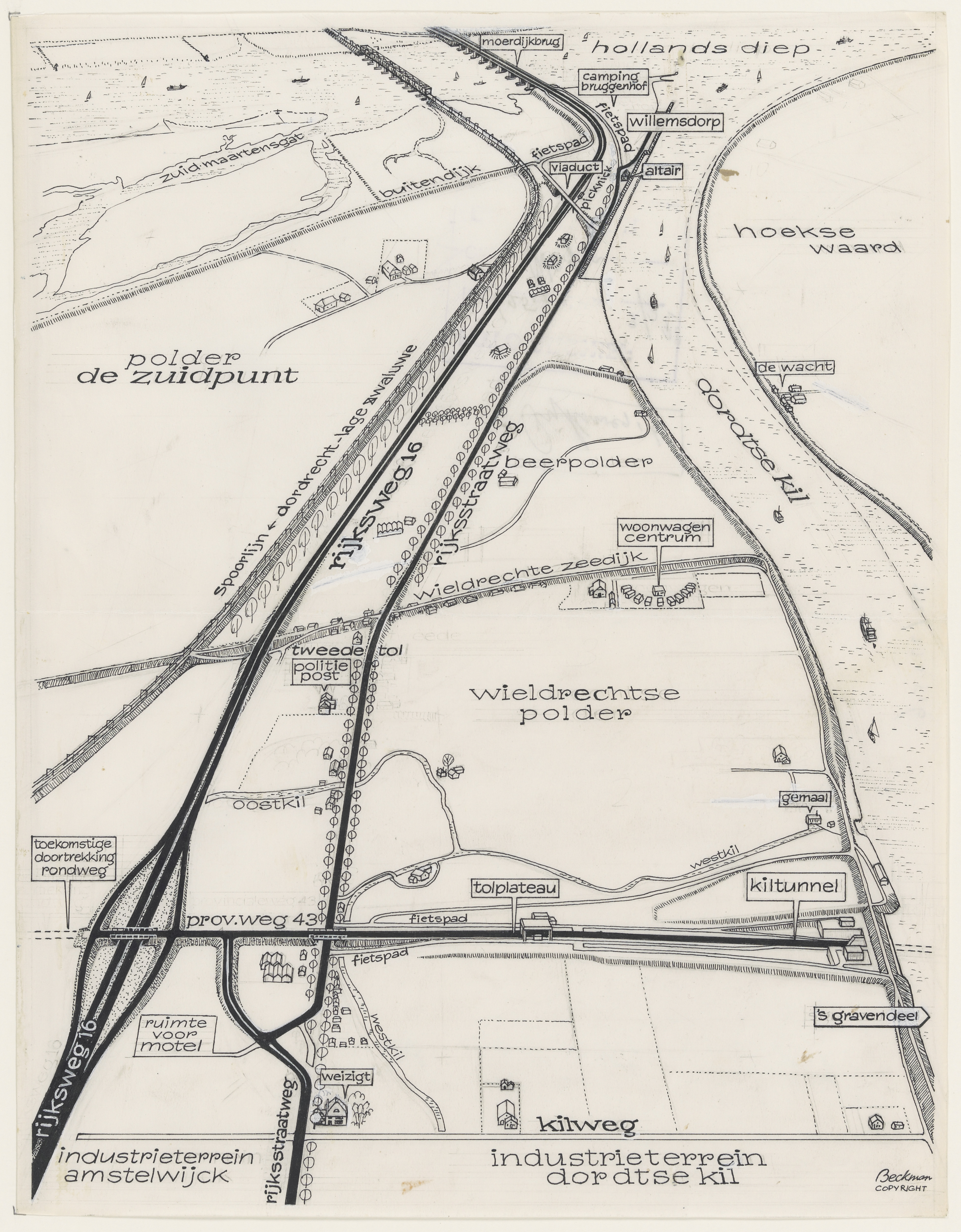 Kaart in vogelvlucht van polder de Zuidpunt bij Willemsdorp, met het accent op de A16.