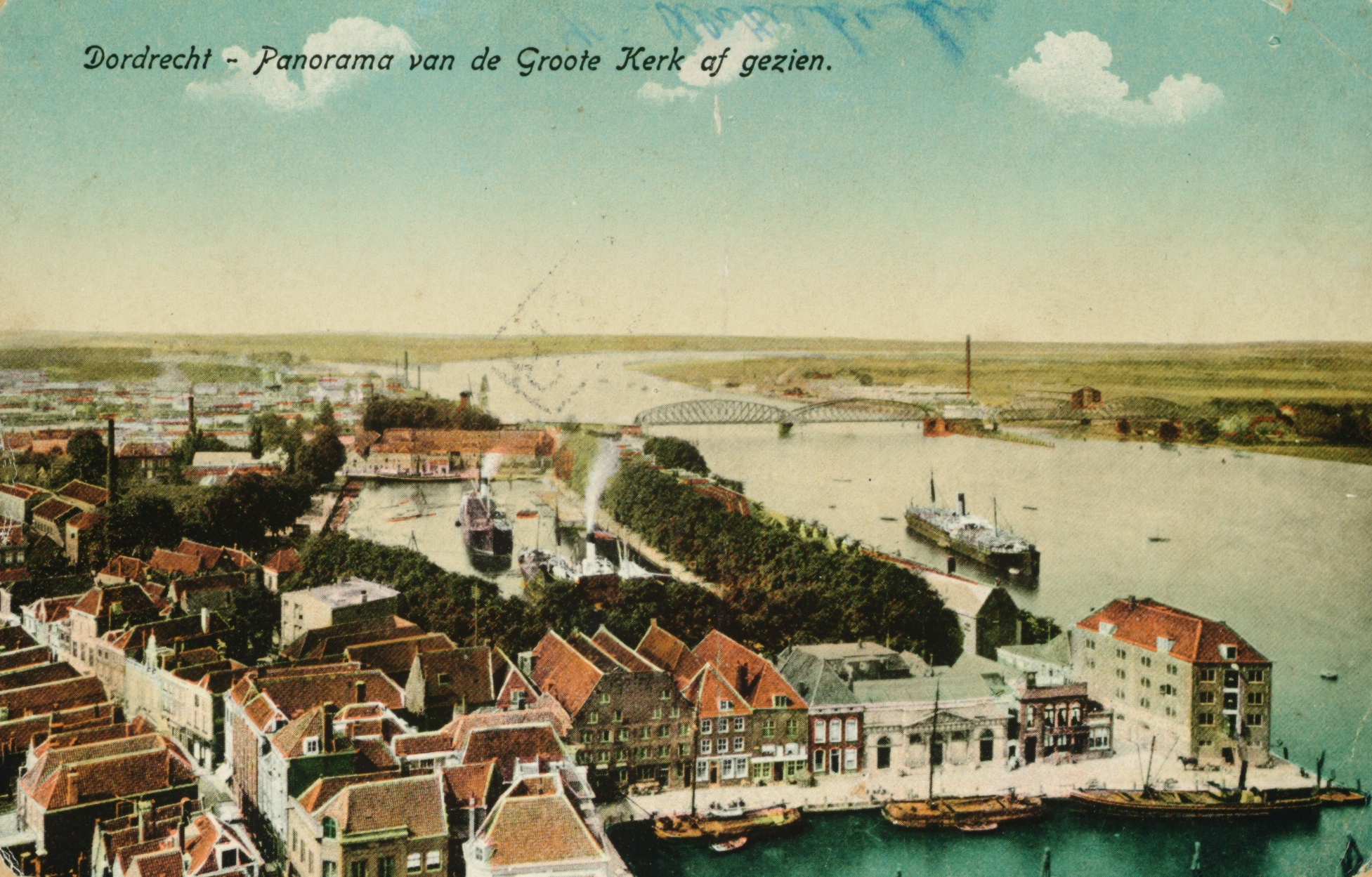 - Panorama, gezien vanaf de Grote Kerk, met rechts in beeld de Spoorbrug richting Zwijndrecht, ca 1906